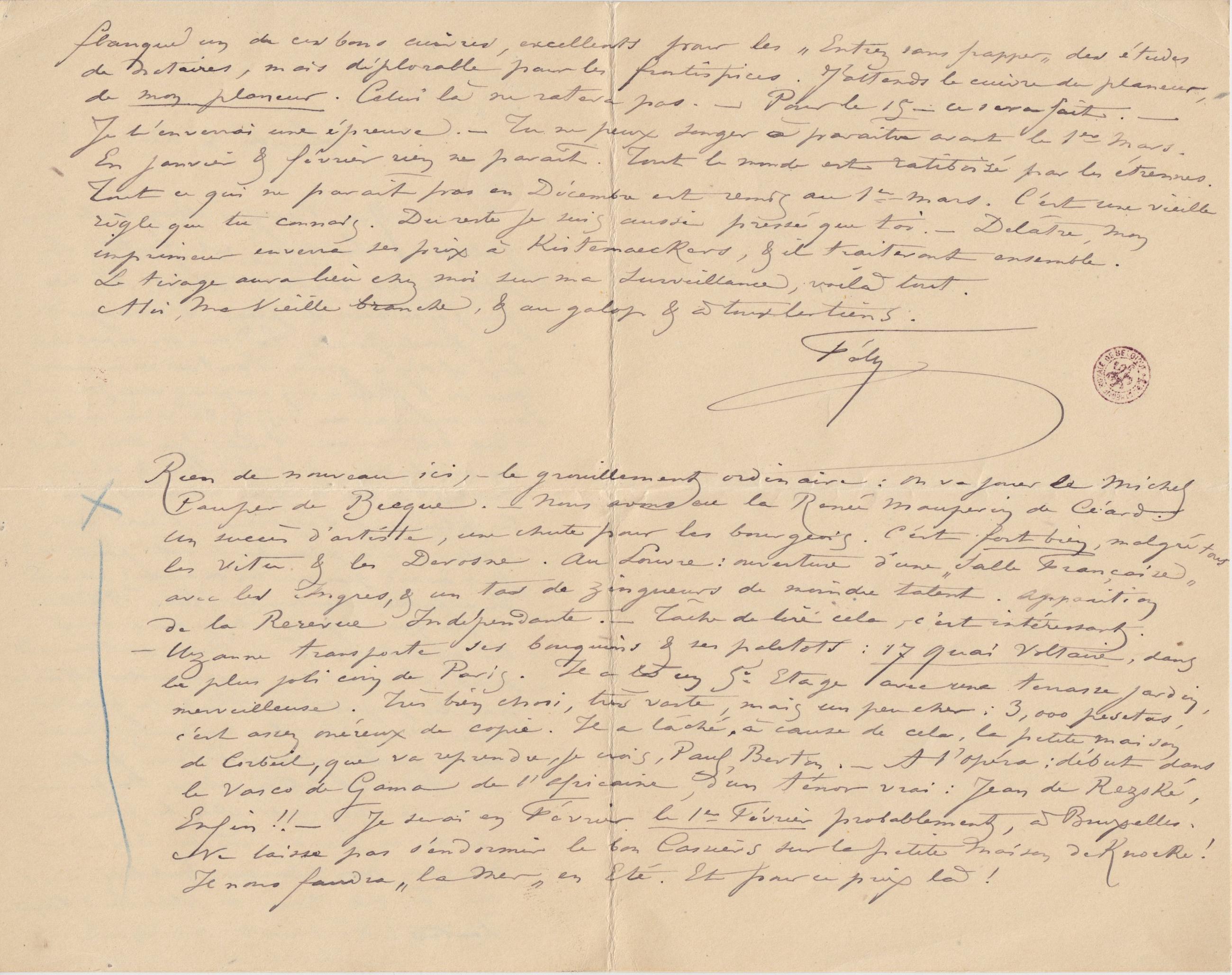 – Uzanne transporte ses bouquins & ses paletots : 17 Quai Voltaire, dans le plus joli coin de Paris. Il a là un 5e Étage avec une terrasse jardin, merveilleuse. Très bien choisi, très vaste, mais un peu cher : 3,000 pesetas, c’est assez onéreux de copie. Il a lâché, à cause de cela, la petite maison de Corbeil, que va reprendre, je crois, Paul Berton. – À l’opéra : début dans le Vasco de Gama de l’africaine, d’un ténor vrai : Jean de Rezské, Enfin !! – Je serai en Février le 1er Février probablement, à Bruxelles. Ne laisse pas s’endormir le bon Cassiers sur la petite maison de Knocke ! Il nous faudra « la mer » en Été. Et pour ce prix là !