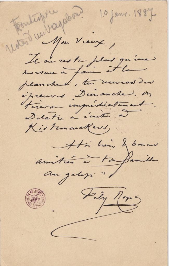 Il ne reste plus qu’une morsure faire à la planche, tu recevras des épreuves Dimanche. On tirera immédiatement. Delâtre a écrit à Kistemaeckers.