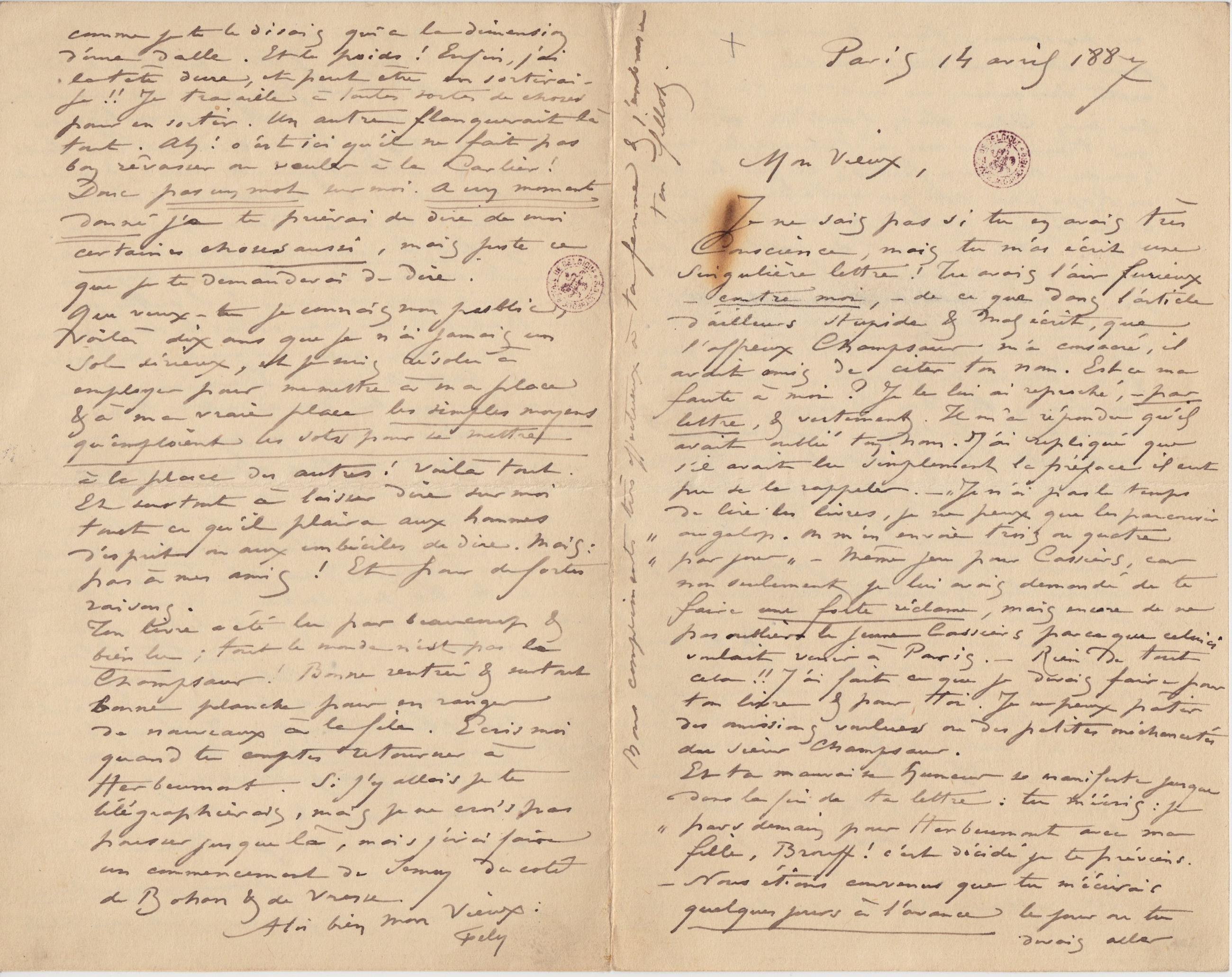 Je ne sais pas si tu en avais très Conscience, mais tu m’as écrit une singulière lettre ! Tu avais l’air furieux – contre moi, – de ce que dans l’article d’ailleurs stupide & mal écrit, que l’affreux Champsaur m’a consacré, il avait omis de citer ton nom. Est ce ma faute à moi ? Je le lui ai reproché, – par lettre, & vertement. Il m’a répondu qu’il avait oublié ton nom. J’ai répliqué que s’il avait lu simplement la préface il eut pu se le rappeler. – « Je n’ai pas le temps de lire les livres, je ne peux que le parcourir au galop. On m’en envoie trois ou quatre par jour » – Même jeu pour Cassiers, car non seulement je lui avais demandé de te faire une forte réclame, mais encore de ne pas oublier le jeune Cassiers parce que celui ci voulait venir à Paris. – Rien de tout cela !! J’ai fait ce que je devais faire pour ton livre & pour toi. Je ne peux pâtir des omissions voulues ou des petites méchancetés du sieur Champsaur.