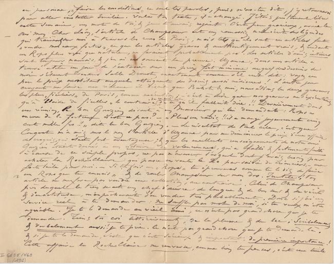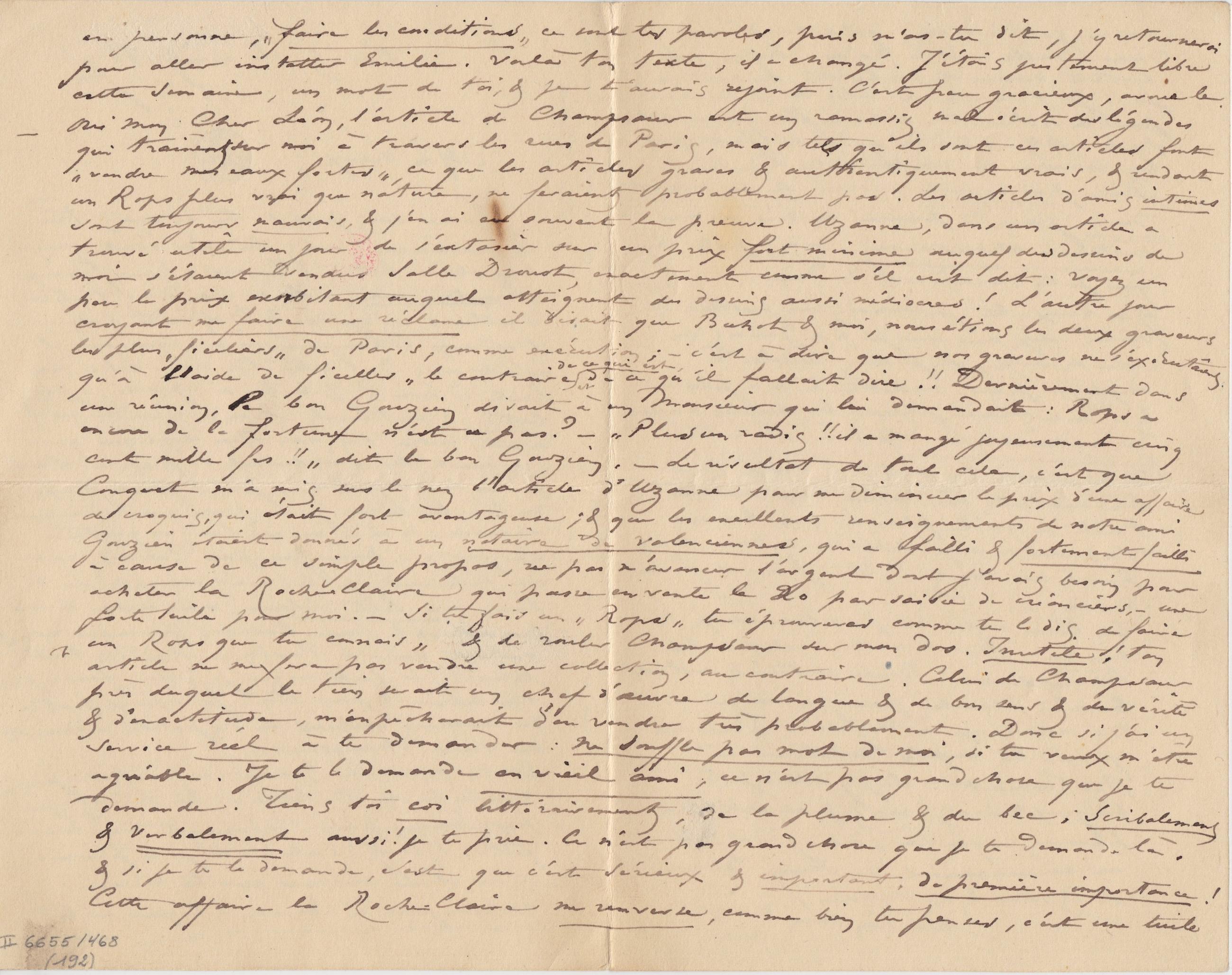– Oui Mon Cher Léon, l’article de Champsaur est un ramassis mal écrit des légendes qui trainent sur moi à travers les rues de Paris, mais tels qu’ils sont ces articles font « vendre mes eaux fortes », ce que les articles graves & authentiquement vrais, & rendant un Rops plus vrai que nature, ne feraient probablement pas. Les articles d’amis intimes sont toujours mauvais, & j’en ai eu souvent la preuve. Uzanne, dans un article a trouvé utile un jour de s’extasier sur un prix fort minime auquel des dessins de moi s’étaient vendus Salle Drouot, exactement comme s’il eut dit : voyez un peu le prix exorbitant auquel atteignent des dessins aussi médiocres ! L’autre jour croyant me faire une réclame il disait que Buhot & moi, nous étions les deux graveurs les plus « ficeliers » de Paris, comme exécution ; – c'est à dire que nos gravures ne s’exécutaient qu’à l’aide de ficelles » le contraire