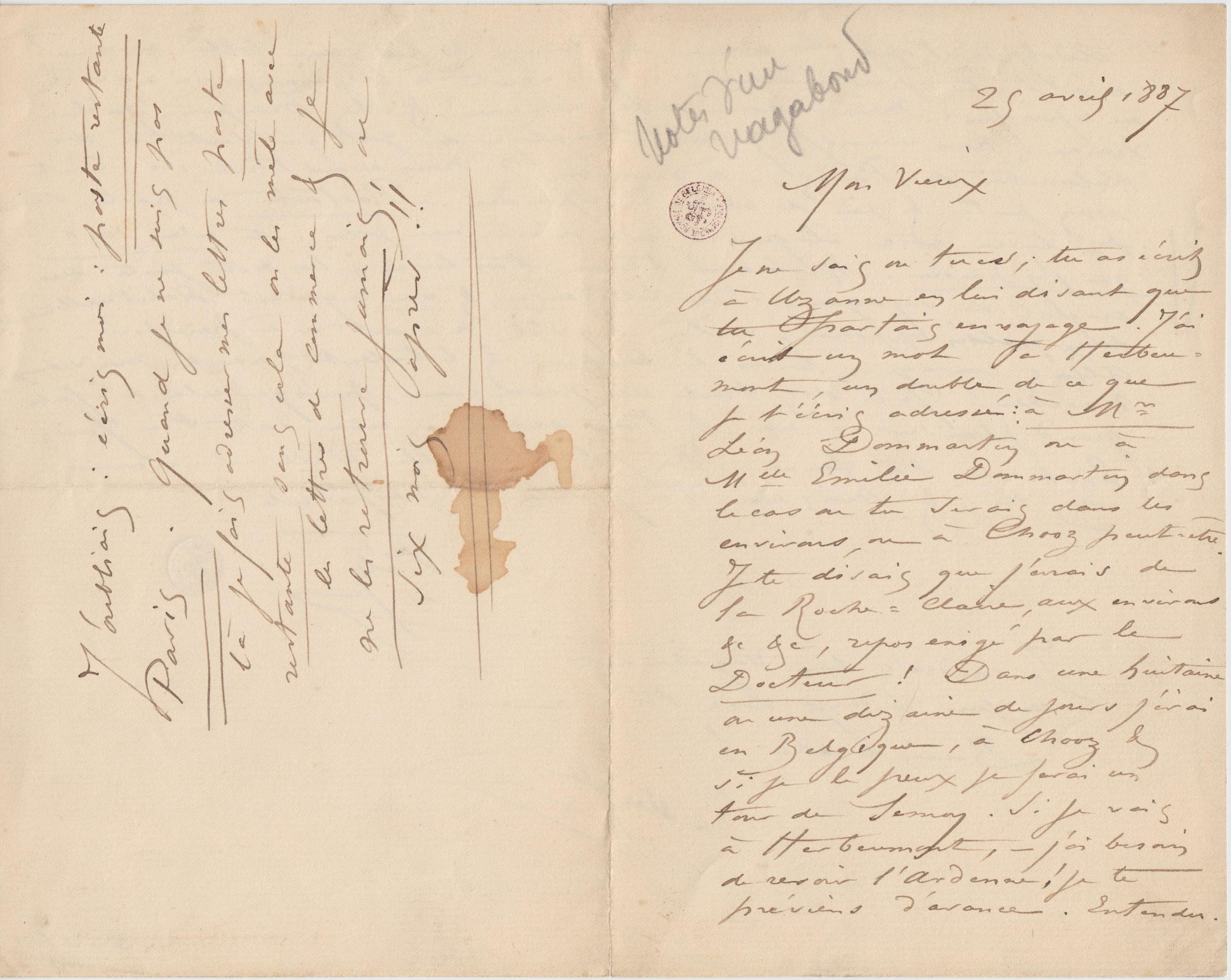 Je ne sais où tu es ; tu as écrit à Uzanne en lui disant que tu partais en voyage. J’ai écrit un mot à Herbeumont, un double de ce que je t’écris adressé : à MrLéon Dommartin ou à MlleÉmilie Dommartin dans le cas où tu serais dans les environs, ou à Chooz peut-être. Je te disais que j’errais de la Roche-Claire, aux environs &c &c, repos exigé par le Docteur ! Dans une huitaine ou une dizaine de jours j’irai en Belgique, à Chooz & si je le peux je ferai un tour de Semoy. Si je vais à Herbeumont, – j’ai besoin de revoir l’Ardenne ! je te préviens d’avance. Entendu.
