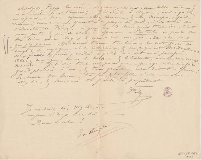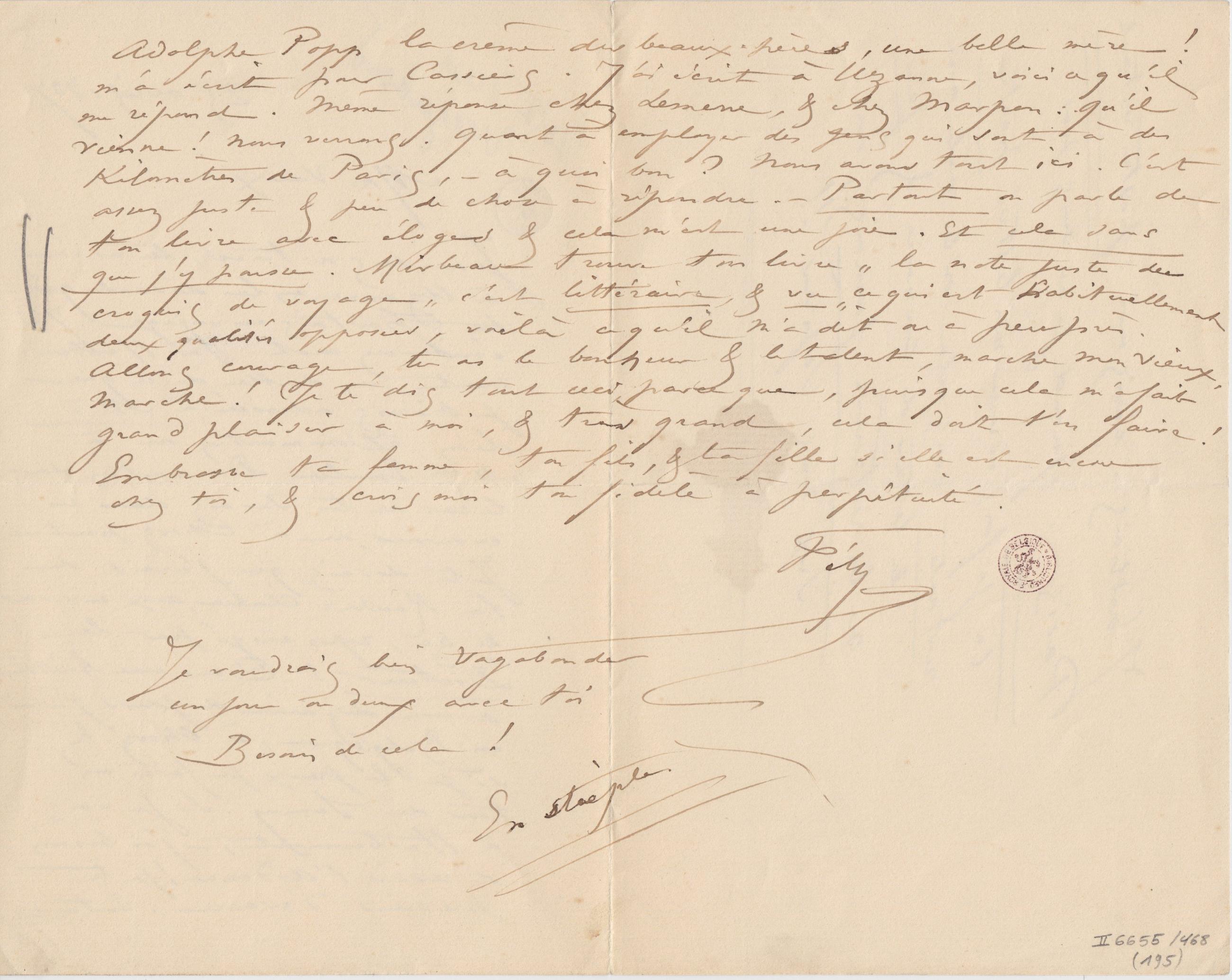 Adolphe Popp la crème des beaux-pères, une belle mère ! m’a écrit par Cassiers. J’ai écrit à Uzanne, voici ce qu’il me répond. Même réponse chez Lemerre, & chez Marpon : qu’il vienne ! nous verrons. Quant à employer des gens qui sont à des kilomètres de Paris, – à quoi bon ? Nous avons tout ici. C’est assez juste & peu de choses à répondre. – Partout on parle de ton livre avec éloges & cela m’est une joie. Et cela sans que j’y pousse. Mirbeau trouve ton livre « la note juste du croquis de voyage » c’est littéraire, & vu » ce qui est habituellement deux qualités opposées, voilà ce qu’il m’a dit ou à peu près.