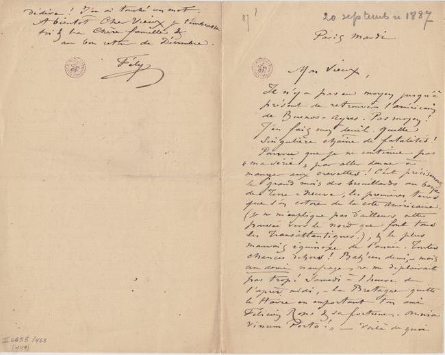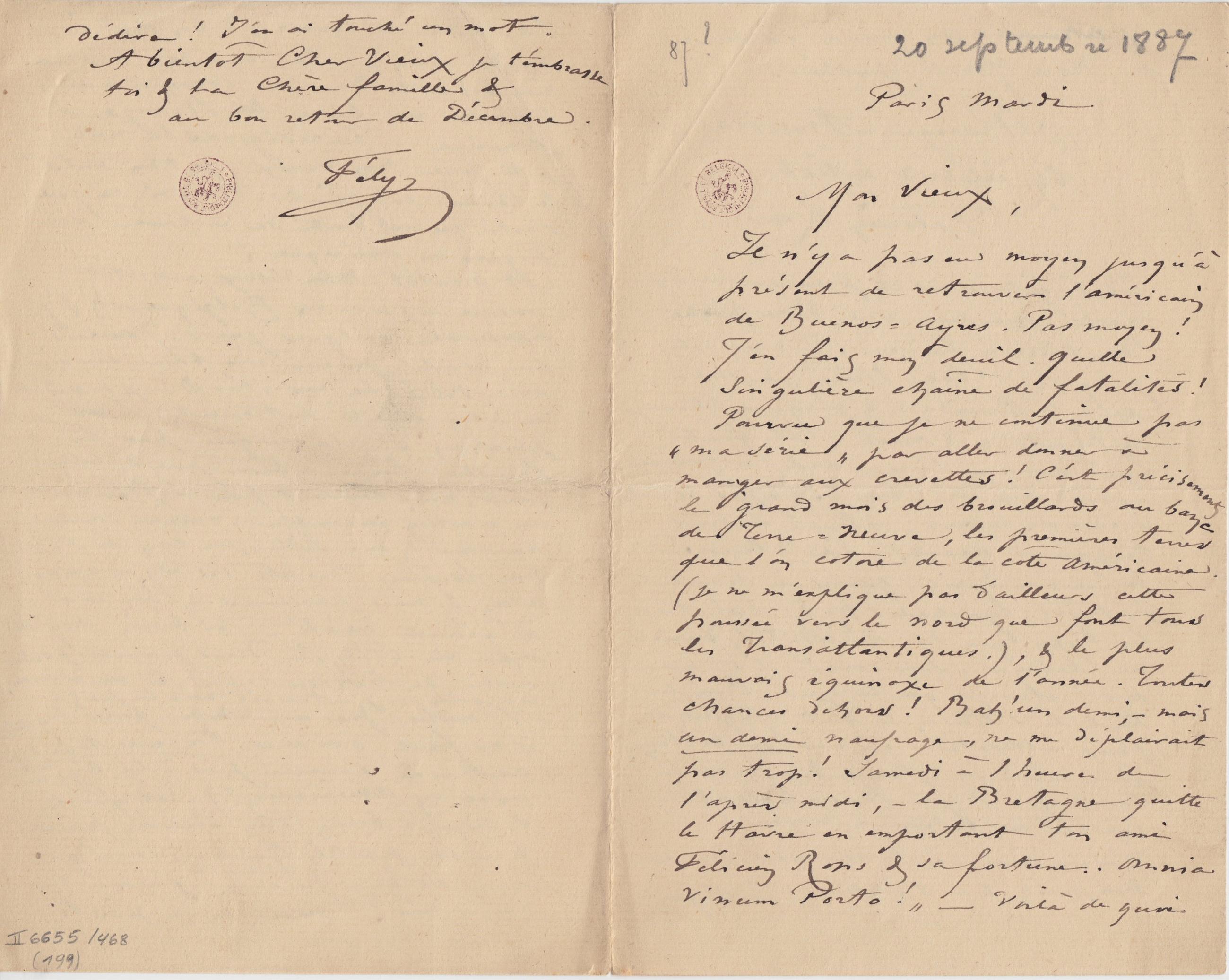 Il n’y a pas eu moyen jusqu’à présent de retrouver l’Américain de Buenos-Ayres. Pas moyen ! J’en fais mon deuil. Quelle singulière chaîne de fatalités ! Pourvu que je ne continue pas « ma série » par aller donner à manger aux crevettes ! C’est précisément le grand mois des brouillards au banc de Terre-Neuve, les premières terres que l’on cotoie de la côté Américaine. (je ne m’explique pas d’ailleurs cette poussée vers le nord que font tous les Transatlantiques.), & le plus mauvais équinoxe de l’année. Toutes chances dehors ! Bah ! un demi, – mais un demi naufrage, ne me déplairait pas trop ! Samedi à 1 heure de l’après midi, – la Bretagne quitte le Havre en emportant ton ami Félicien Rops & sa fortune. Omnia Vinum Porto ! » – Voilà de quoi