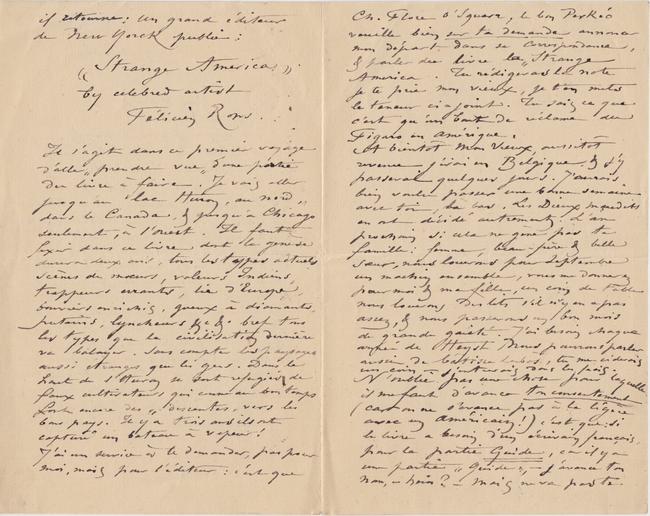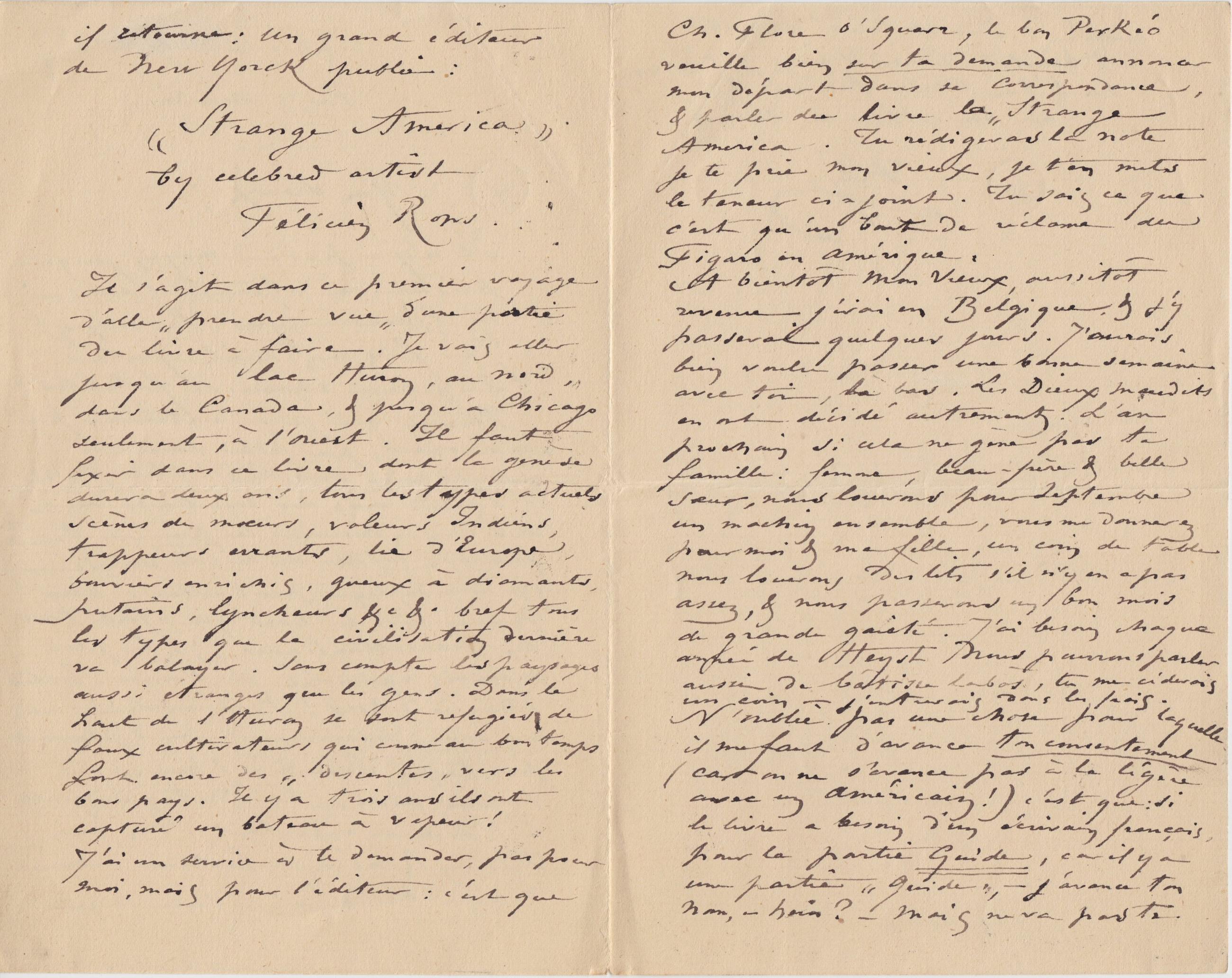 Le projet éditorial Strange America qui doit être publié par un grand éditeur new-yorkais est un projet de guide de voyages dont Rops doit fournir les dessins. Il évoque la possibilité de confier la partie texte au soin de son ami Léon Dommartin (1839-1919). Le nom de Carter est cité dans plusieurs lettres mais ce dernier est à ce jour non identifié. Le voyage est construit dans le but de « prendre vue d’une partie du livre à faire ».