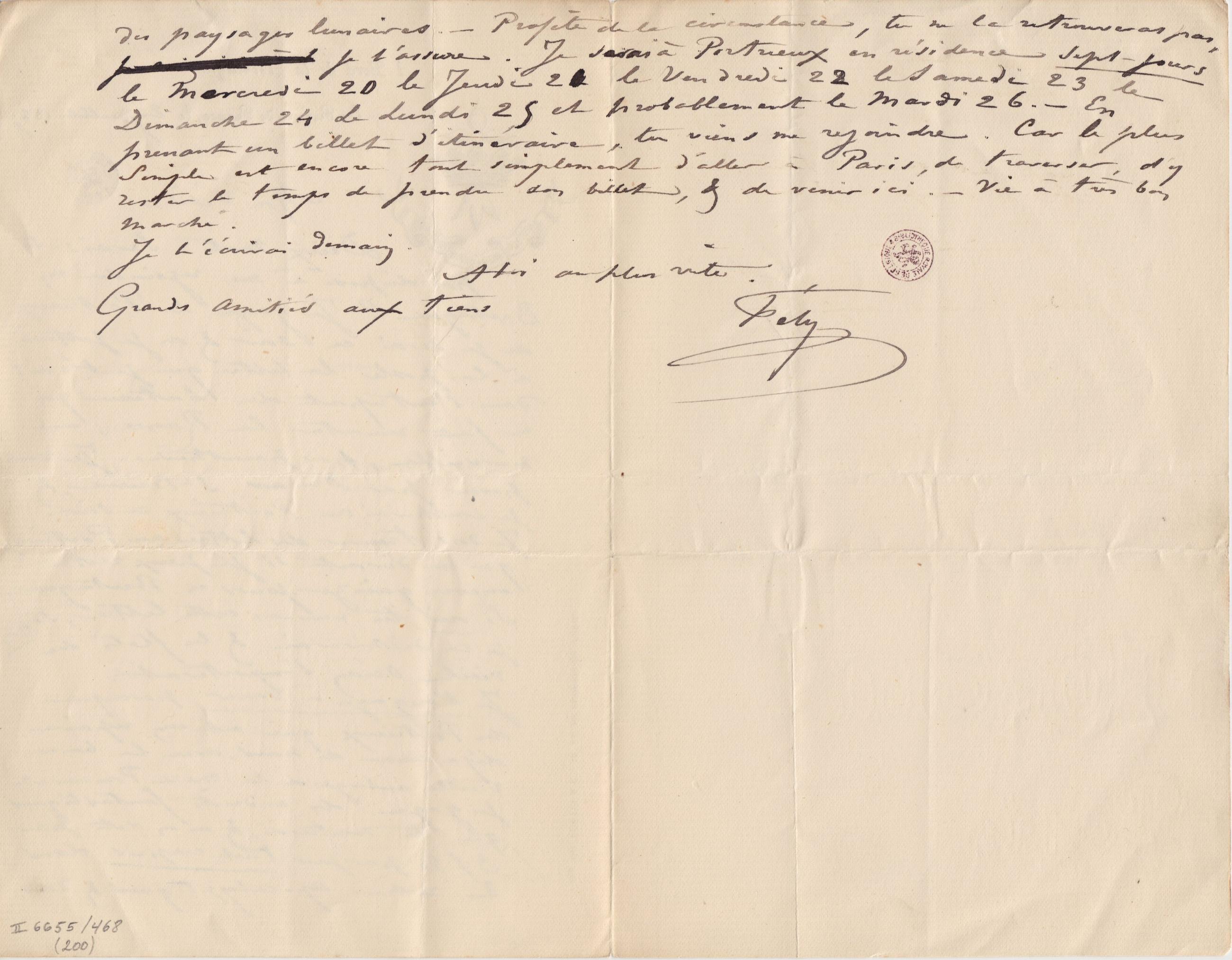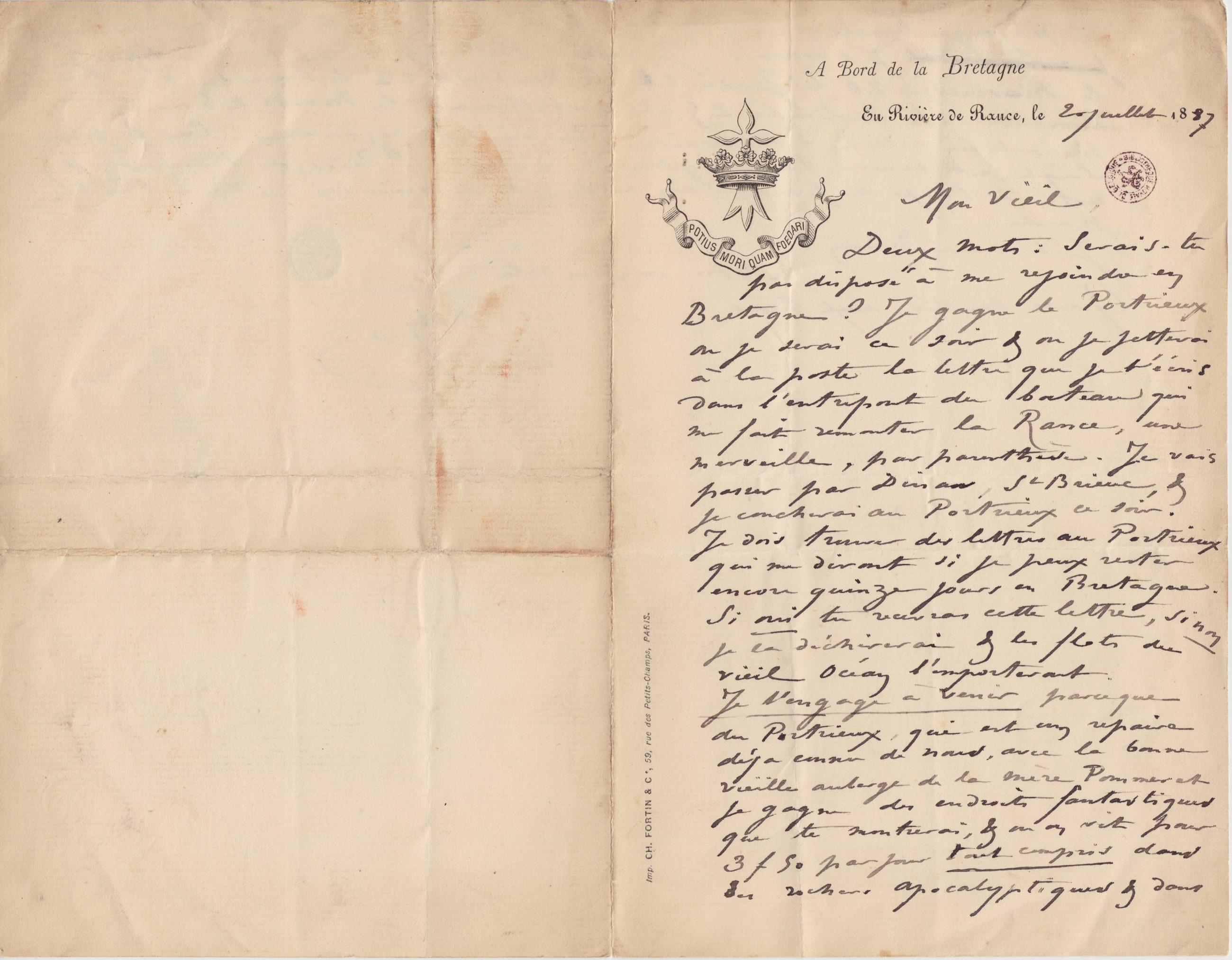 Deux mots : serais-tu pas disposé à me rejoindre en Bretagne ? Je gagne le Portrieux où je serai ce soir & où je jetterai à la poste la lettre que je t’écris dans l’entrepont du bateau qui me fait remonter la Rance, une merveille, par parenthèse. Je vais passer par Dinan, St Brieuc, & je coucherai à Portrieux ce soir. Je dois trouver des lettres au Portrieux qui me diront si je peux rester encore quinze jours en Bretagne. Si oui tu recevras cette lettre, si non je la déchirerai & les flots du vieil océan l’emporteront.