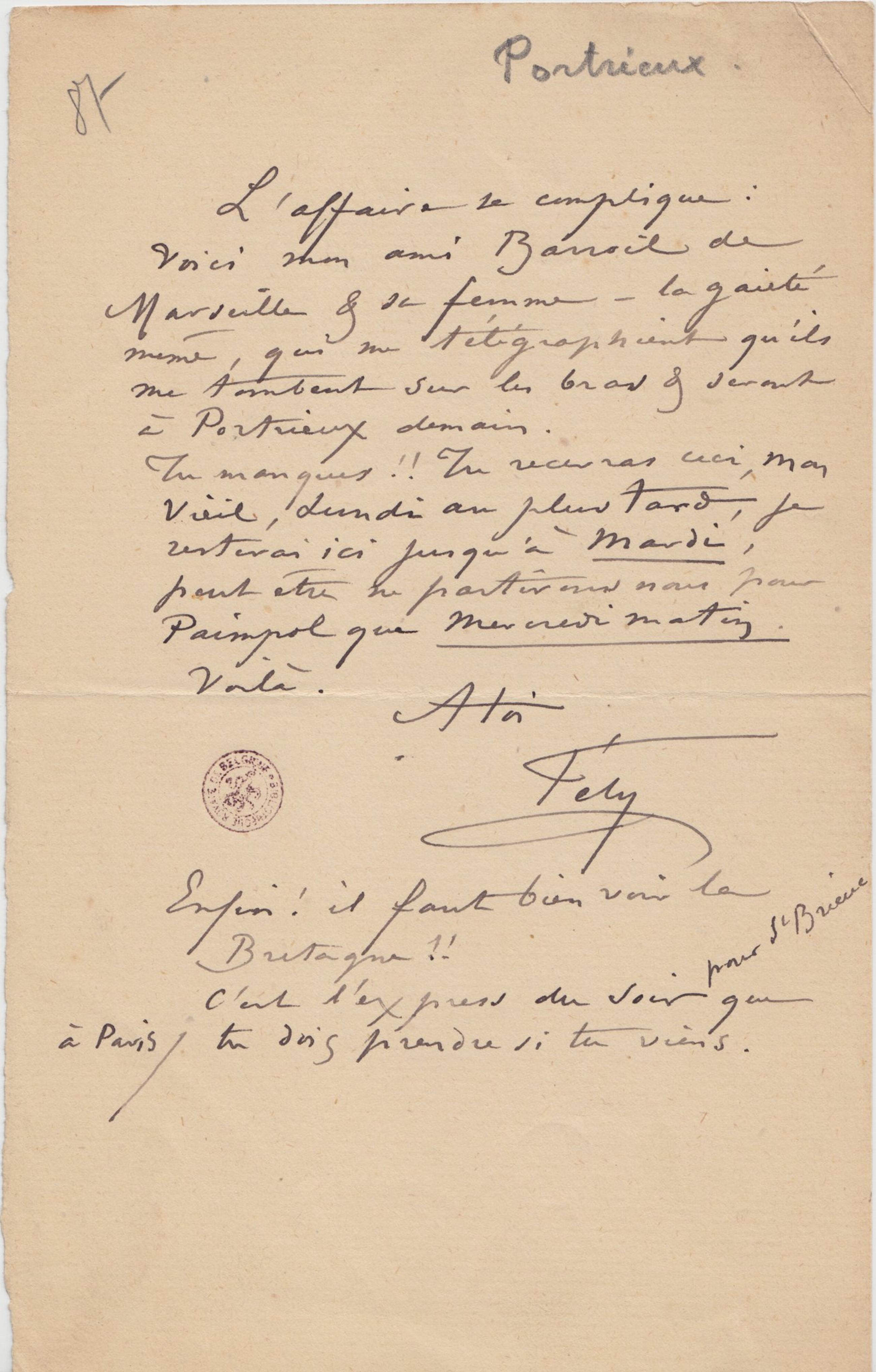L’affaire se complique : voici mon ami Barroil de Marseille & sa femme – la gaieté même, qui me télégraphient qu’ils me tombent sur les bras & seront à Portrieux demain.