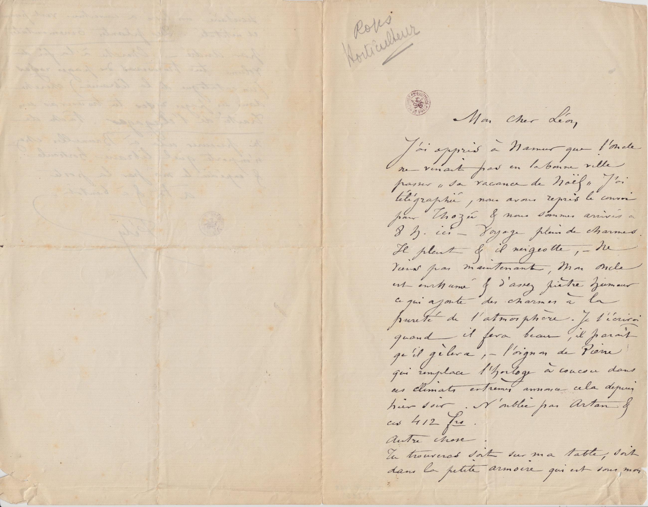 J’ai appris à Namur que l’oncle ne venait pas en la bonne ville passer « sa vacance de Noël » J’ai télégraphié, nous avons repris le convoi pour Thozée & nous sommes arrivés à 8h. ici – Voyage plein de charmes. Il pleut & il neigeotte, – Ne viens pas maintenant, Mon oncle est enrhumé & d’assez piètre humeur ce qui ajoute des charmes à la pureté de l’atmosphère. Je t’écrirai quand il fera beau, il paraît qu’il gèlera, – l’oignon de Pierre qui remplace l’horloge à coucou dans ces climats extrèmes annonce cela depuis hier soir. N’oublie pas Artan & ces 412 frs.