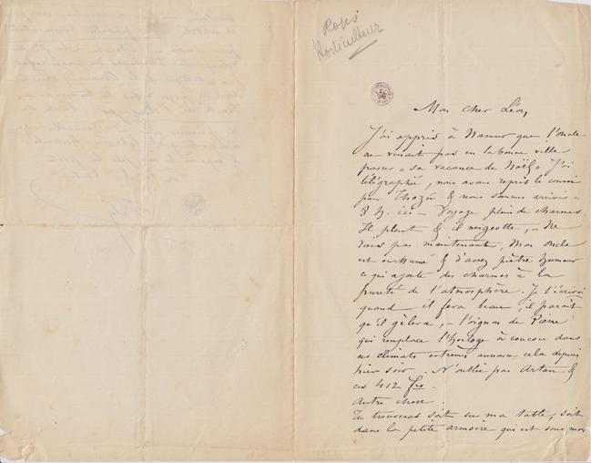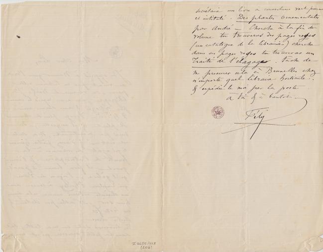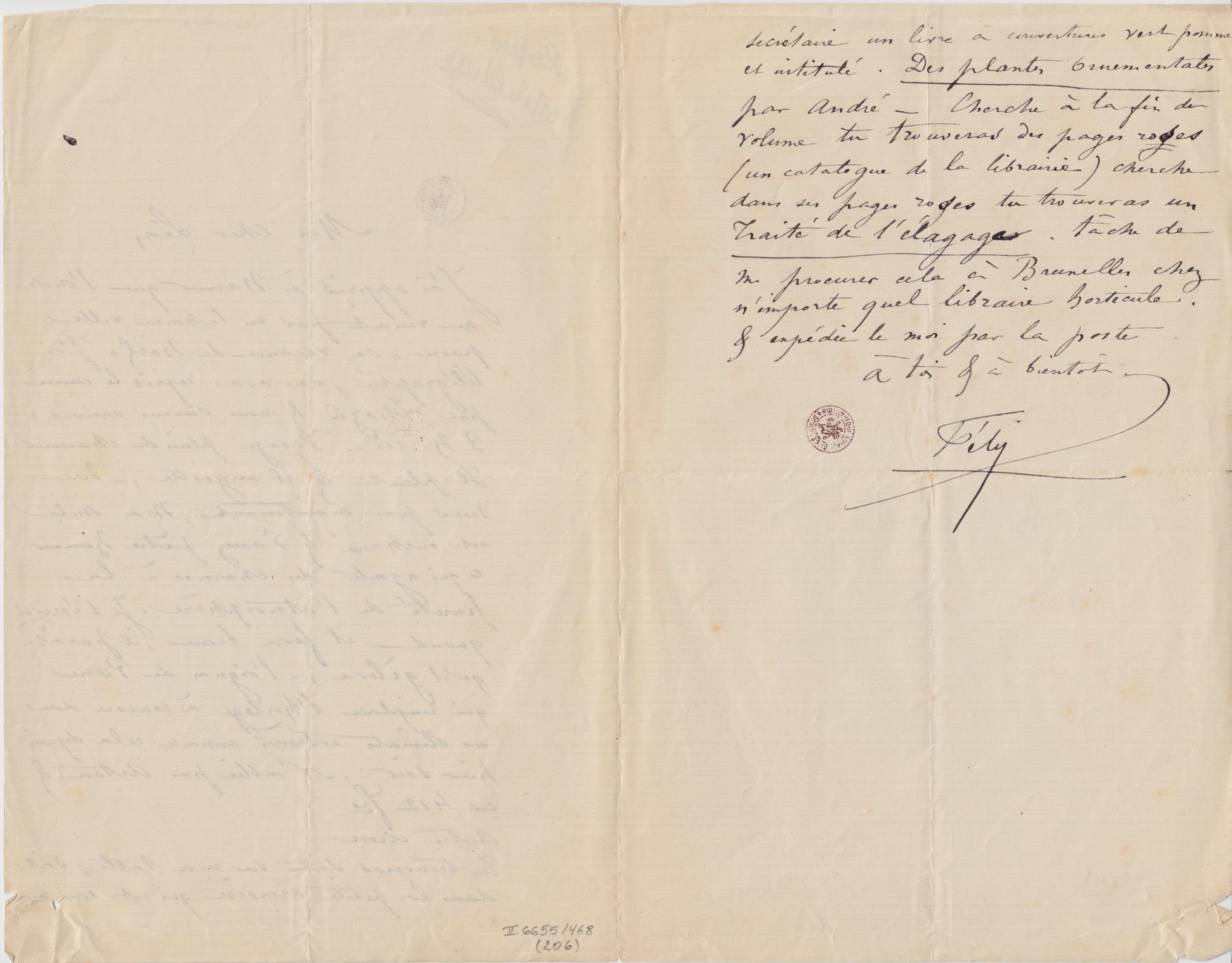 secrétaire un livre à couvertures vert pomme et intitulé. Des plantes Ornementales par André – Cherche à la fin du volume tu trouveras des pages roses (un catalogue de la librairie) cherche dans ses pages roses tu trouveras un Traité de l’élagage. tâche de me procurer cela à Bruxelles chez n’importe quel libraire horticule. & expédie le moi par la poste.
