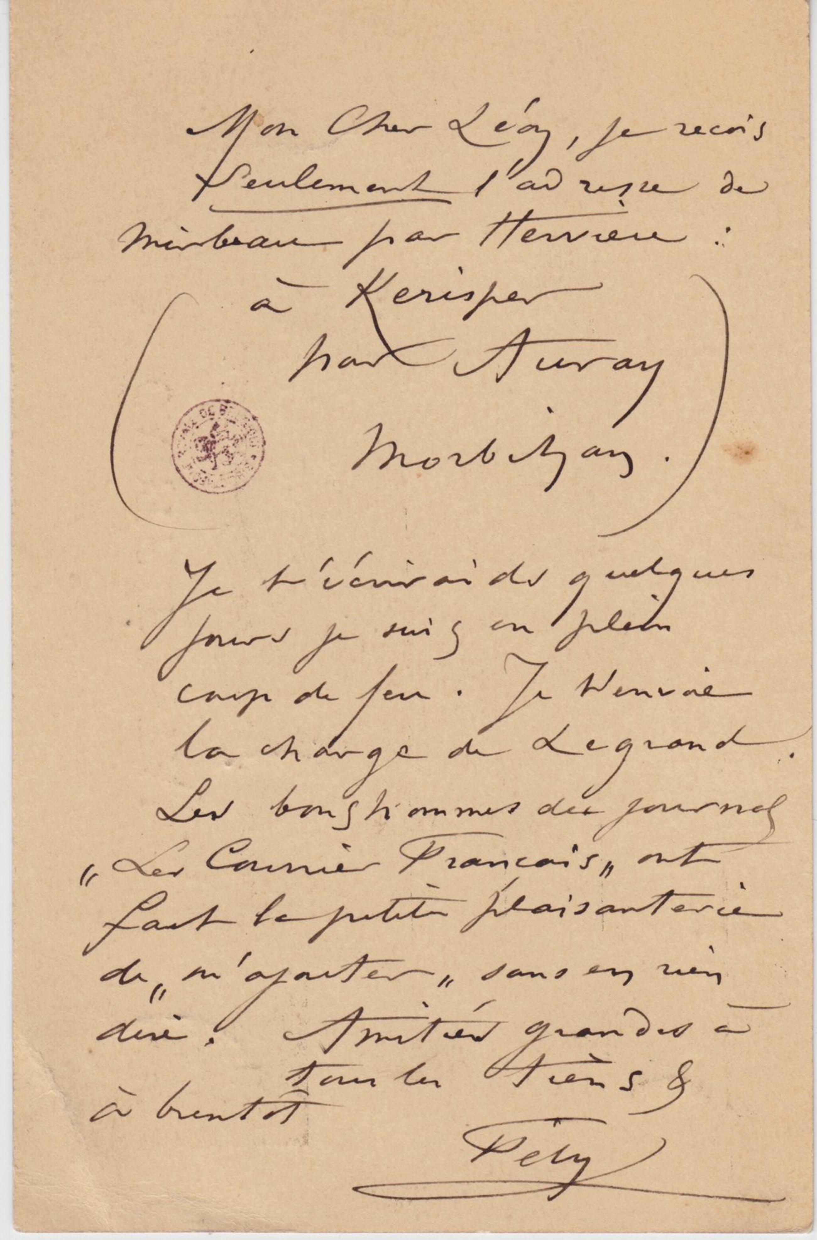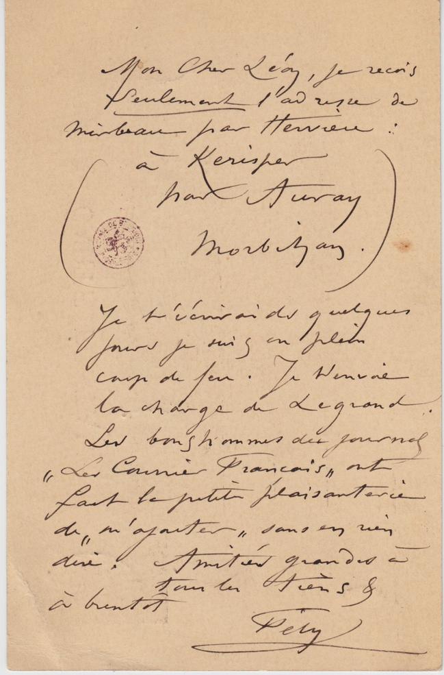 Je t’écrirai dans quelques jours je suis en plein coup de feu. Je t’envoie la charge de Legrand. Les bonshommes du journal « Le Courrier Français » ont fait la petite plaisanterie de « m’ajouter » sans en rien dire.