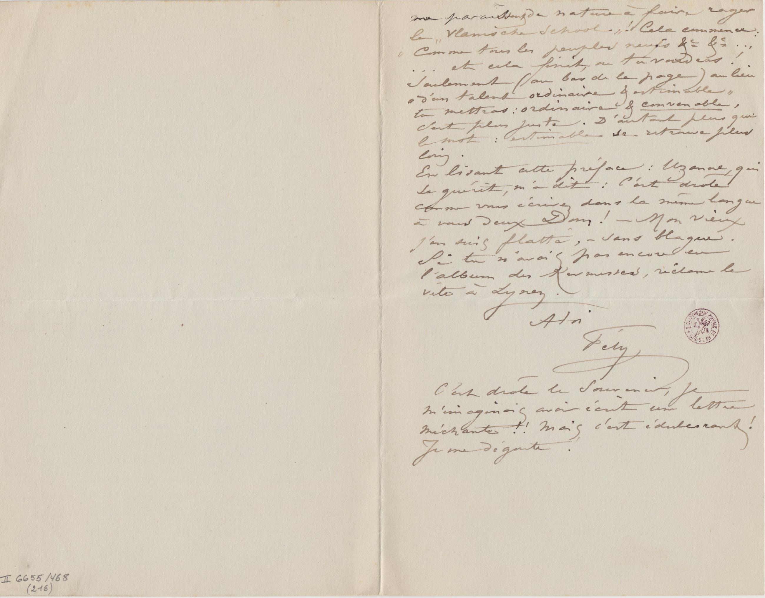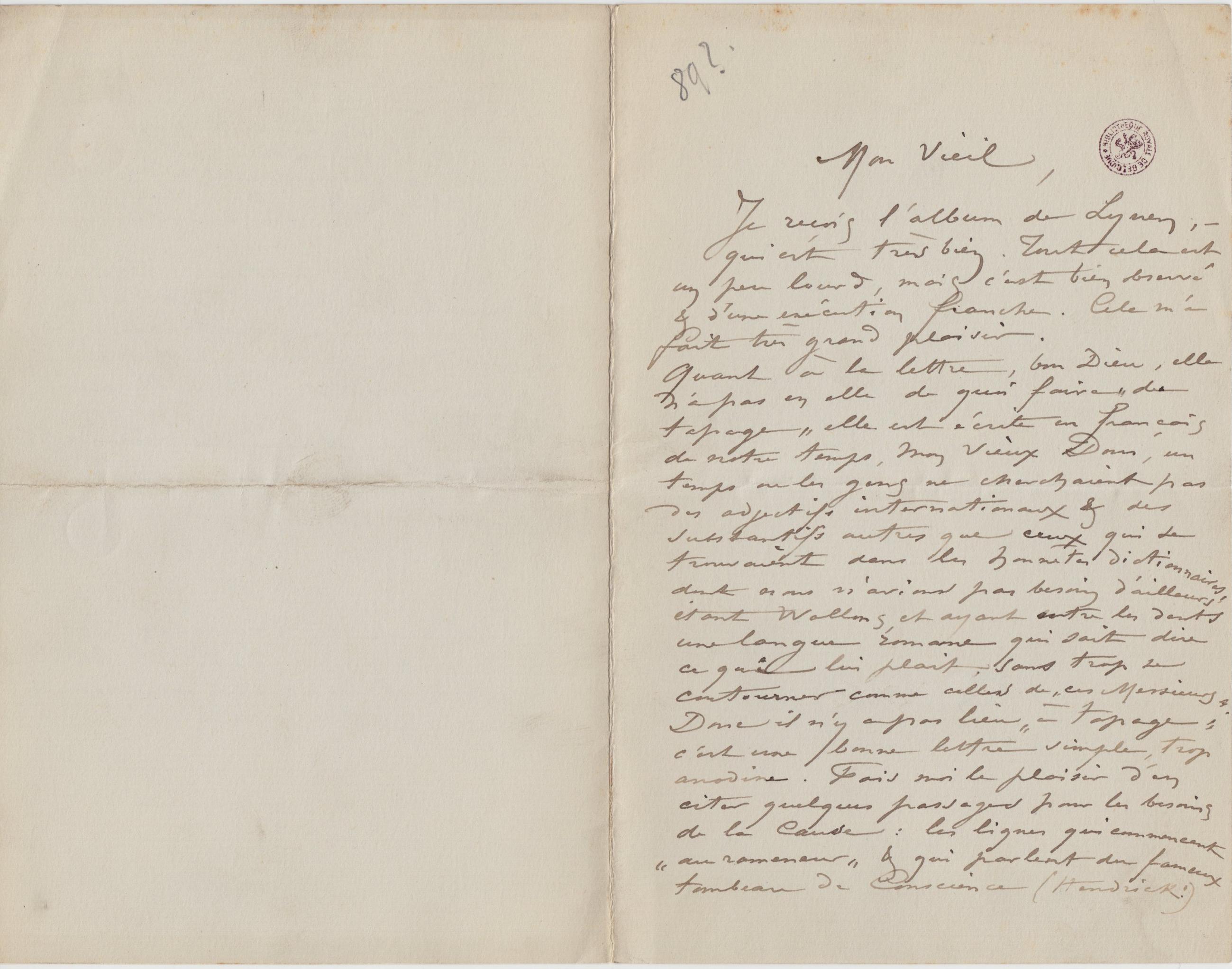 Quant à la lettre, bon Dieu, elle n’a pas en elle de quoi faire « du tapage » elle est écrite en français de notre temps, Mon Vieux Dom, un temps où les gens ne cherchaient pas des adjectifs internationaux & des substantifs autres que ceux qui se trouvaient dans les honnêtes dictionnaires, dont nous n’avions pas besoin d’ailleurs étant Wallons, et ayant entre les dents une langue romane qui sait dire ce qui lui plait, sans trop se contourner comme celles de « ces Messieurs ». Donc il n’y a pas lieu « à tapage » c’est une bonne lettre simple, trop anodine. Fais moi le plaisir d’en citer quelques passages pour les besoins de la cause : les lignes qui commencent « au rameneur » & qui parlent du fameux tombeau de Conscience (Hendrick !)