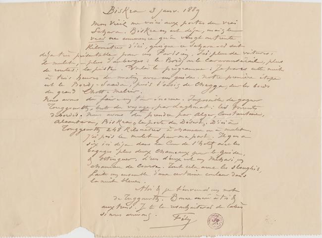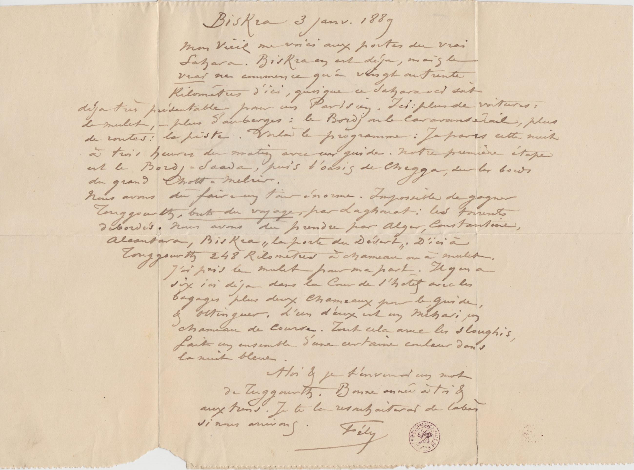 me voici aux portes du vrai Sahara. Biskra en est déja, mais le vrai ne commence qu’a vingt ou trente kilomêtres d’ici, quoique ce Sahara-ci soit déja très présentable pour un Parisien. Ici : plus de voitures, de mulet, – plus d’auberges : le Bordj ou le Caravansérail, plus de routes : la piste. Voilà le programme : Je pars cette nuit à trois heures du matin avec un guide. Notre première étape est le Bordj-Saada, puis l’oasis de Chegga, sur les bords du grand Chott-Melrir.