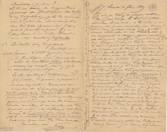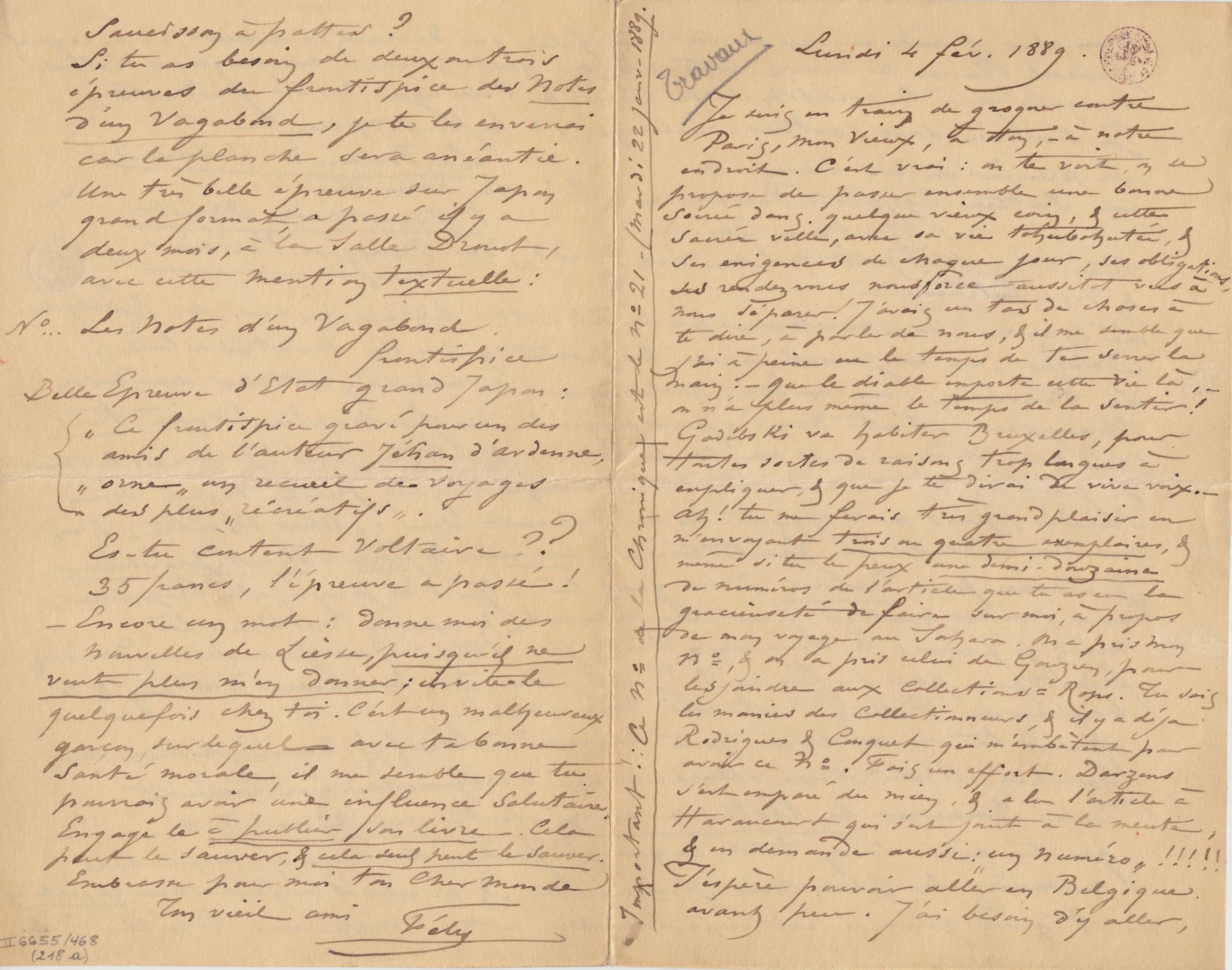Si tu as besoin de deux ou trois épreuves du frontispice des Notes d’un Vagabond, je te les enverrai car la planche sera anéantie. Une très belle épreuve sur Japon grand format, a passé il y a deux mois, à la Salle Drouot, avec cette mention textuelle :