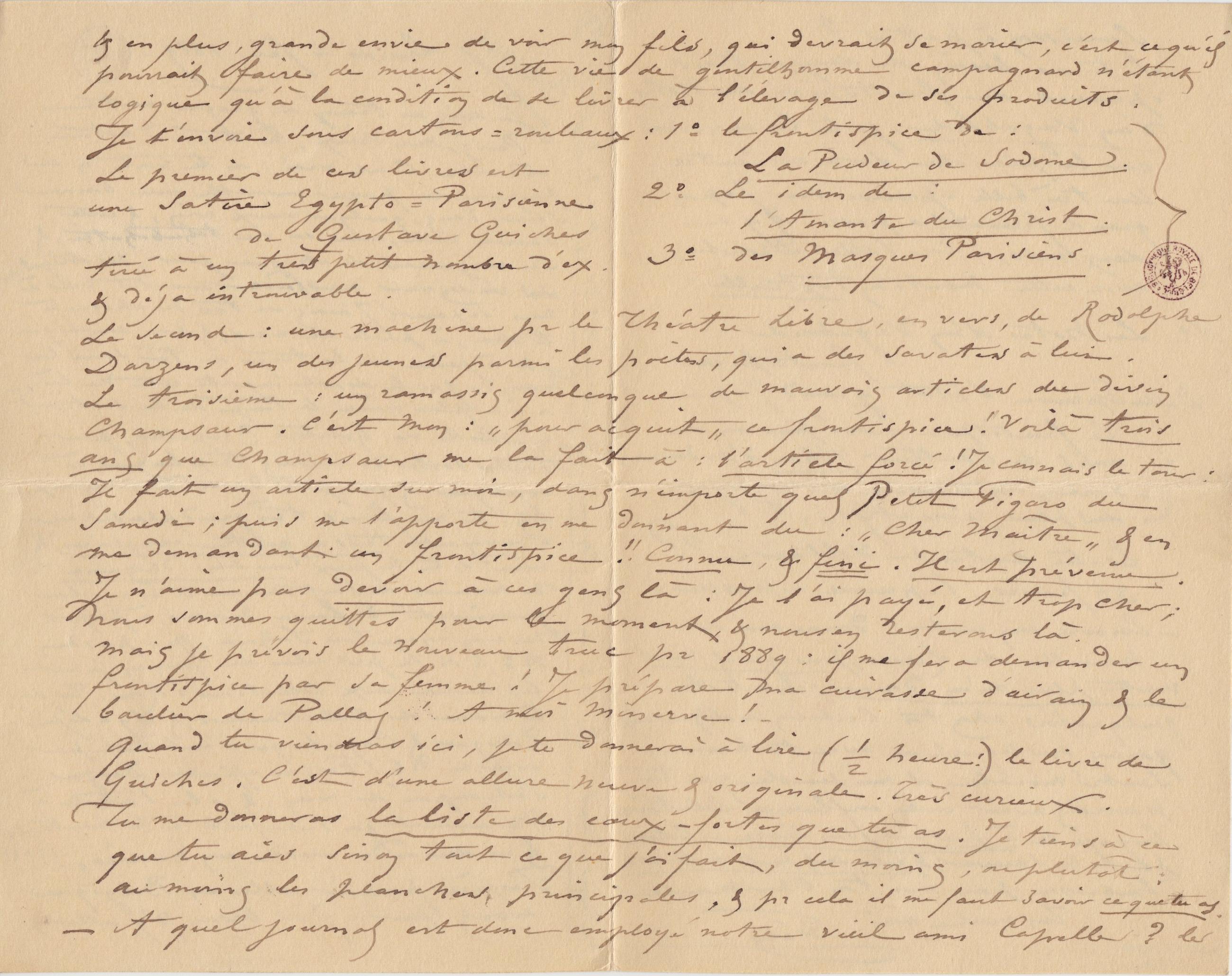 & en plus, grande envie de voir mon fils, qui devrait se marier, c’est ce qu’il pourrait faire de mieux. Cette vie de gentilhomme campagnard n’étant logique qu’à la condition de se livrer à l’élevage de ses produits. Je t’envoie sous cartons-rouleaux : 1° le frontispice de : La Pudeur de Sodome. 2° Le idem de : L’Amante du Christ. 3° des Masques Parisiens.