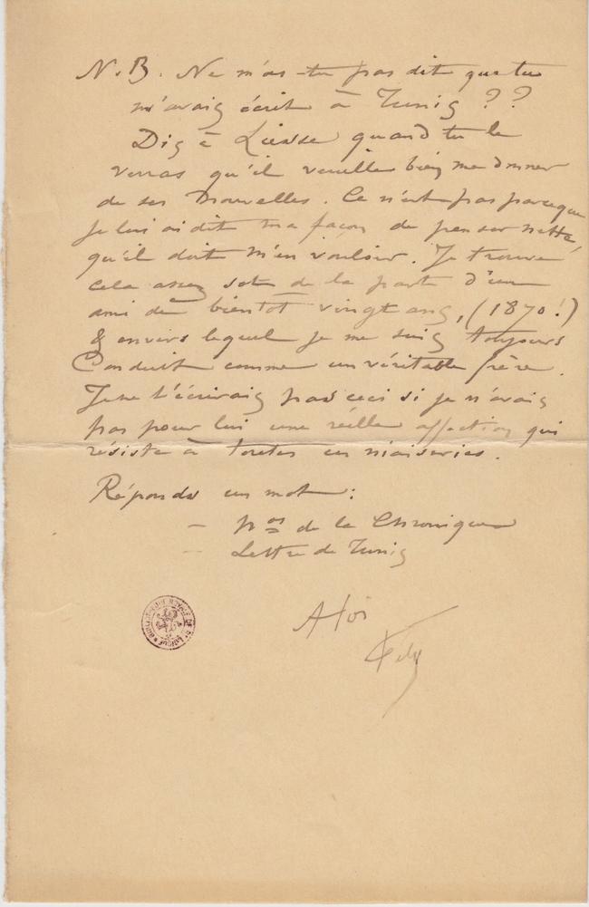 N.B. ne m’as-tu pas dit que tu m’avais écrit à Tunis ?? Dis à Liesse quand tu le verras qu’il veuille bien me donner de ses nouvelles. Ce n’est pas parceque je lui ai dit ma façon de penser nette, qu’il doit m’en vouloir. Je trouve cela assez sot de la part d’un ami de bientôt vingt ans, (1870 !) & envers lequel je me suis toujours Conduit comme un véritable frère. Je ne t’écrirais pas ceci si je n’avais pas pour lui une réelle affection qui résiste à toutes ces niaiseries.