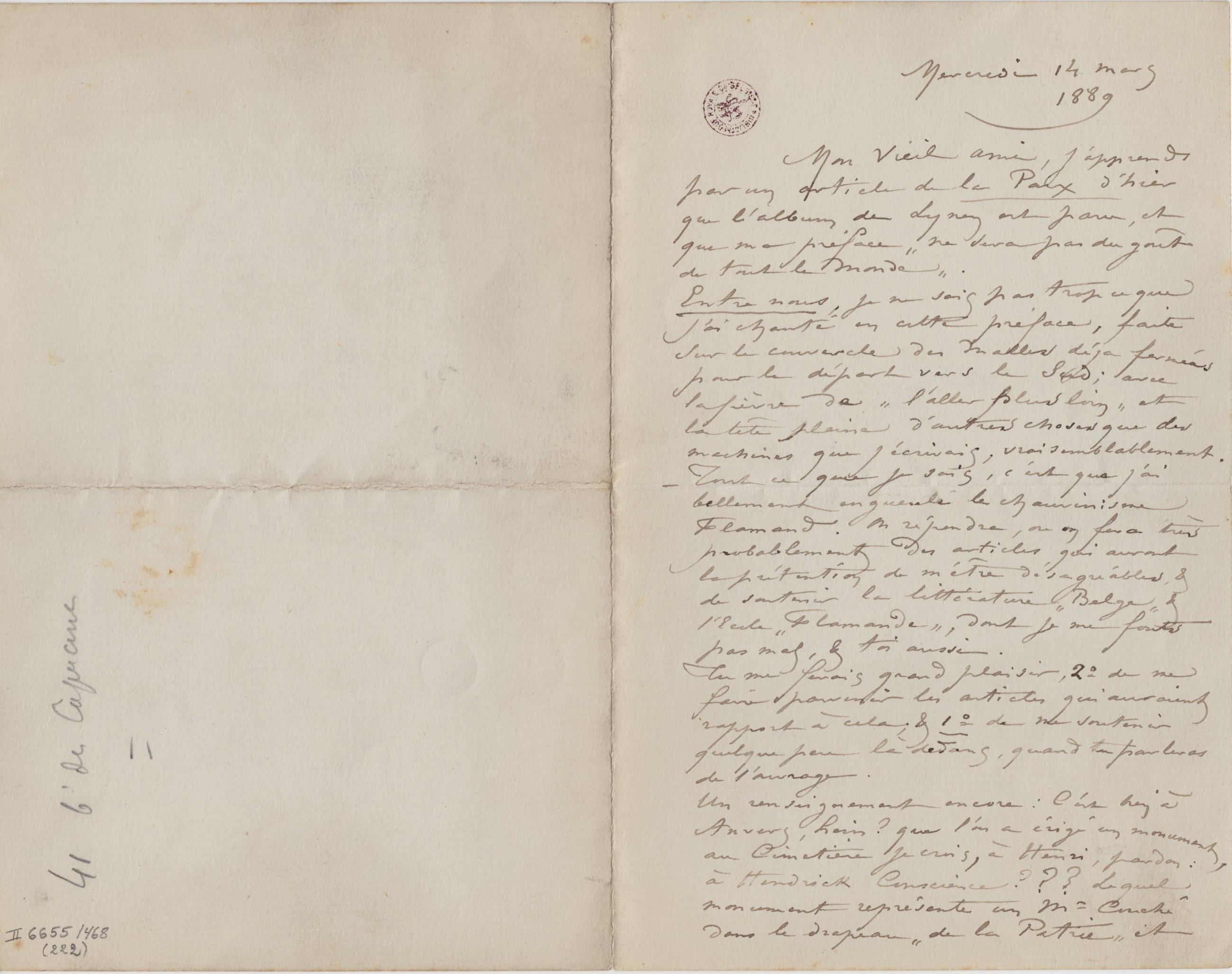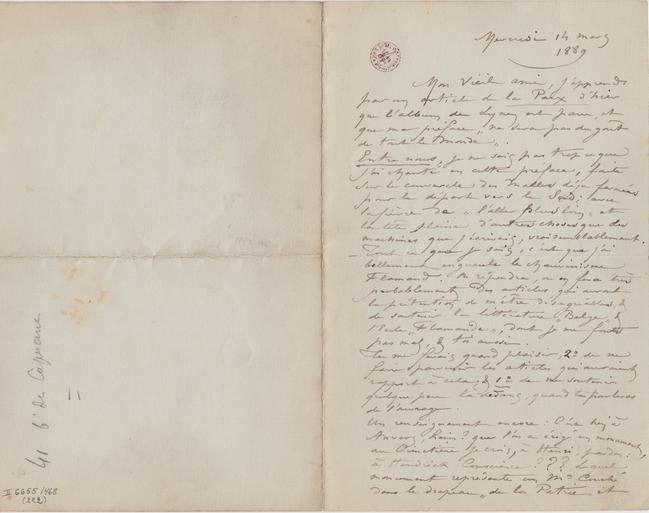– Tout ce que je sais, c’est que j’ai bellement engueulé le chauvinisme Flamand. On répondra, ou on fera très probablement des articles qui auront la prétention de m’être désagréables, & de soutenir la littérature « Belge » & l’École « Flamande », dont je me fouts pas mal, & toi aussi.