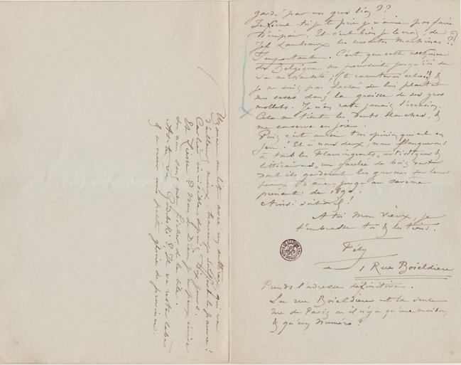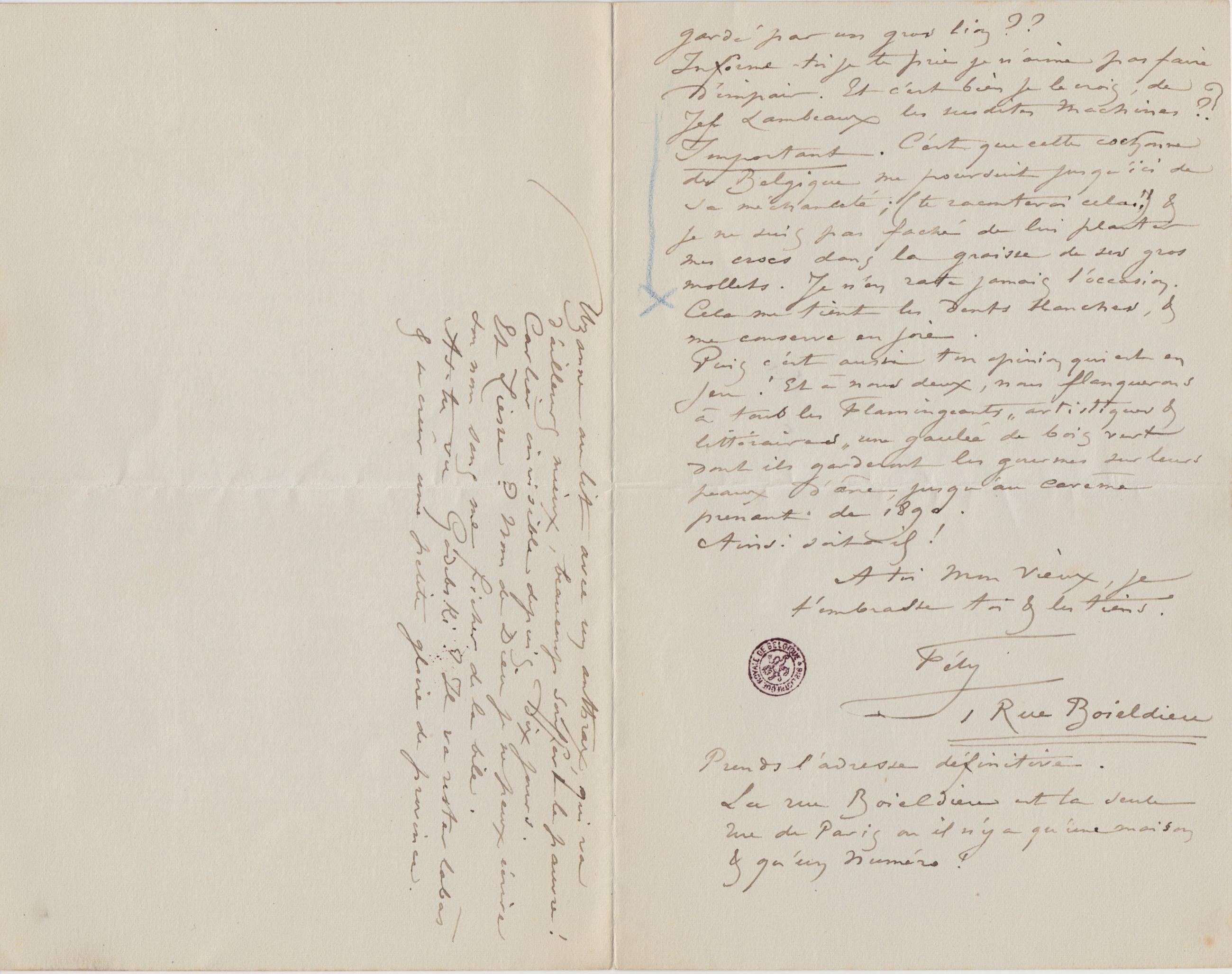 Informe-toi je te prie je n’aime pas faire d’impair. Et c’est bien je le crois, de Jef Lambeaux les susdites machines ?? Important. C’est que cette cochonne de Belgique me poursuit jusqu’ici de sa méchanceté ; (te raconterai cela !!) & je ne suis pas facher de lui planter mes crocs dans la graisse de ses gros mollets. Je n’en rate jamais l’occasion. Cela me tient les dents blanches, & me conserve en joie.
