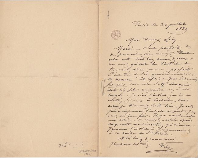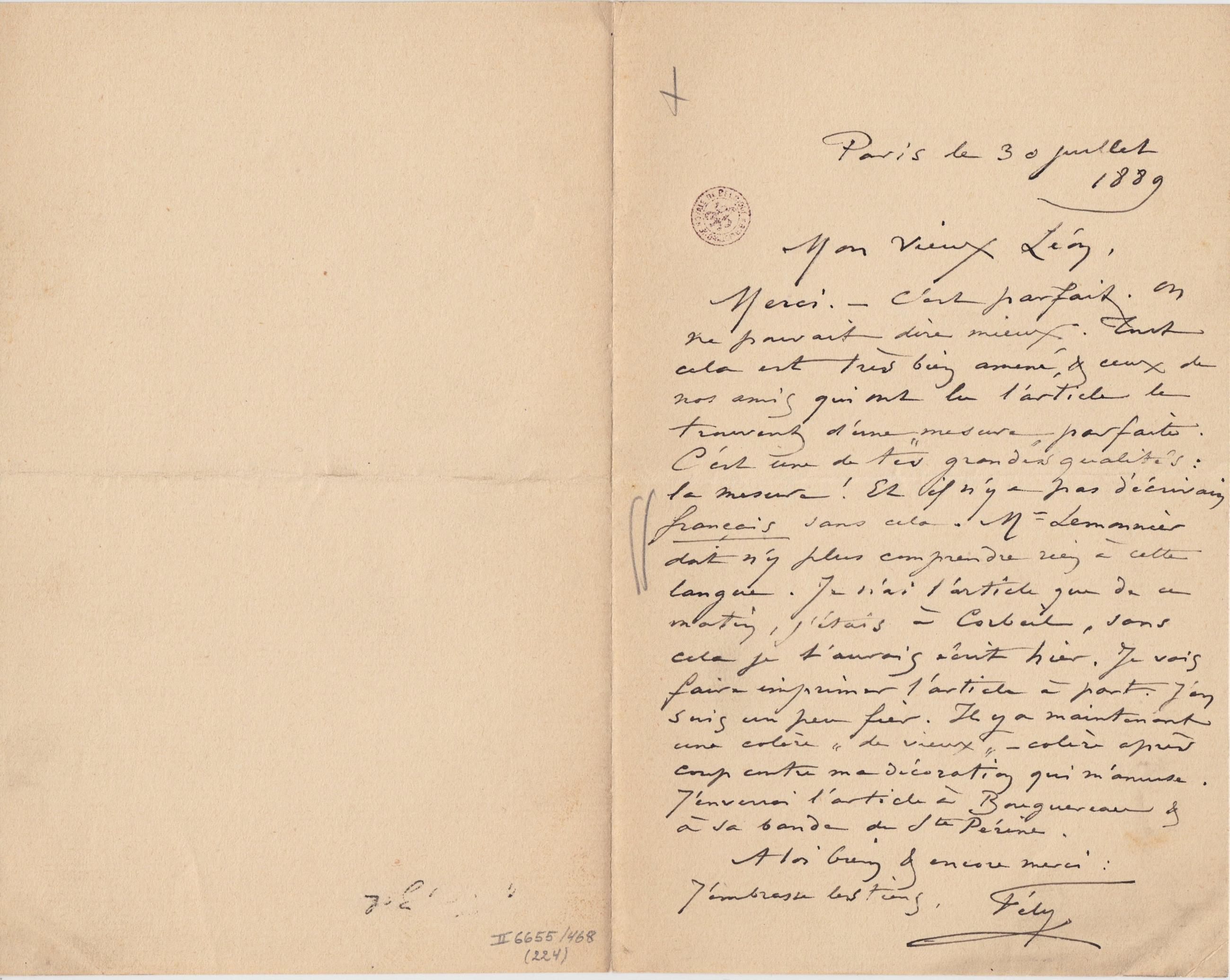 Merci. – C’est parfait. On ne pouvait dire mieux. Tout cela est très bien amené, & ceux de nos amis qui ont lu l’article le trouvent d’une « mesure » parfaite. C’est une de tes grandes qualités : la mesure ! Et il n’y a pas d’écrivain français sans cela. Mr Lemonnier doit n’y plus comprendre rien à cette langue. Je n’ai l’article que de ce matin, j’étais à Corbeil, sans cela je t’aurais écrit hier. Je vais faire imprimer l’article à part. J’en suis un peu fier. Il y a maintenant une colère « de vieux » – colère après coup contre ma décoration qui m’amuse. J’enverrai l’article à Bouguereau & à sa bande de Ste Périne.