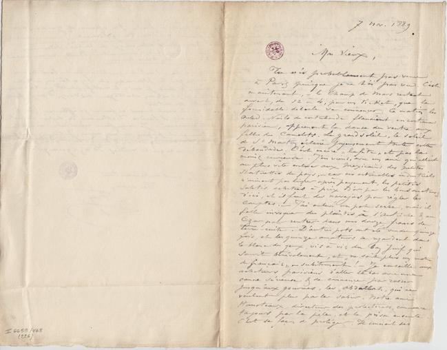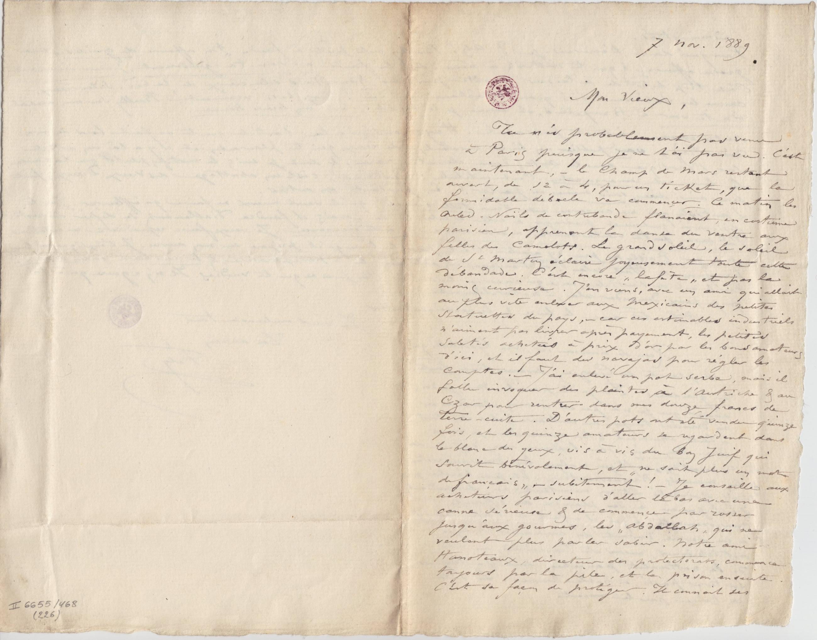 Tu n’es probablement pas venu à Paris puisque je ne t’ai pas vu. C’est maintenant, – le Champ de Mars restant ouvert, de 12 à 4, pour un ticket, que la formidable débacle va commençer. Ce matin les Ouled-Naïls de contrebande flanaîent, en costume parisien, apprenant la danse du ventre aux filles des Camelots. Le grand soleil, le soleil de St Martin éclaire joyeusement toute cette débandade. C’est encore « la fête » et pas la moins curieuse. J’en viens, avec un ami qui allait au plus vite enlever aux Mexicains des petites statuettes du pays, – car ces estimables industriels n’aiment pas livrer après payement, les petites saletés achetées à prix d’or par les bons amateurs d’ici, et il faut des navajas pour régler les comptes. – J’ai enlevé un pot serbe, mais il fallu invoquer des plaintes à l’Autriche & au Czar pour rentrer dans mes douze francs de Terre-cuite. D’autres pots ont été vendu quinze fois, et les quinze amateurs se regardent dans le blanc des yeux, vis à vis du bon Juif qui sourit bénévolement, et « ne sait plus un mot de français » – subitement ! – Je conseille aux acheteurs parisiens d’aller là bas avec une canne sérieuse & de commençer par rosser jusqu’aux gourmes, les « Abdallah » qui ne veulent plus parler sabir. Notre ami Hanoteaux, directeur des protectorats, commence toujours par la pile, et la prison ensuite. C’est sa façon de protéger. Il connait ses