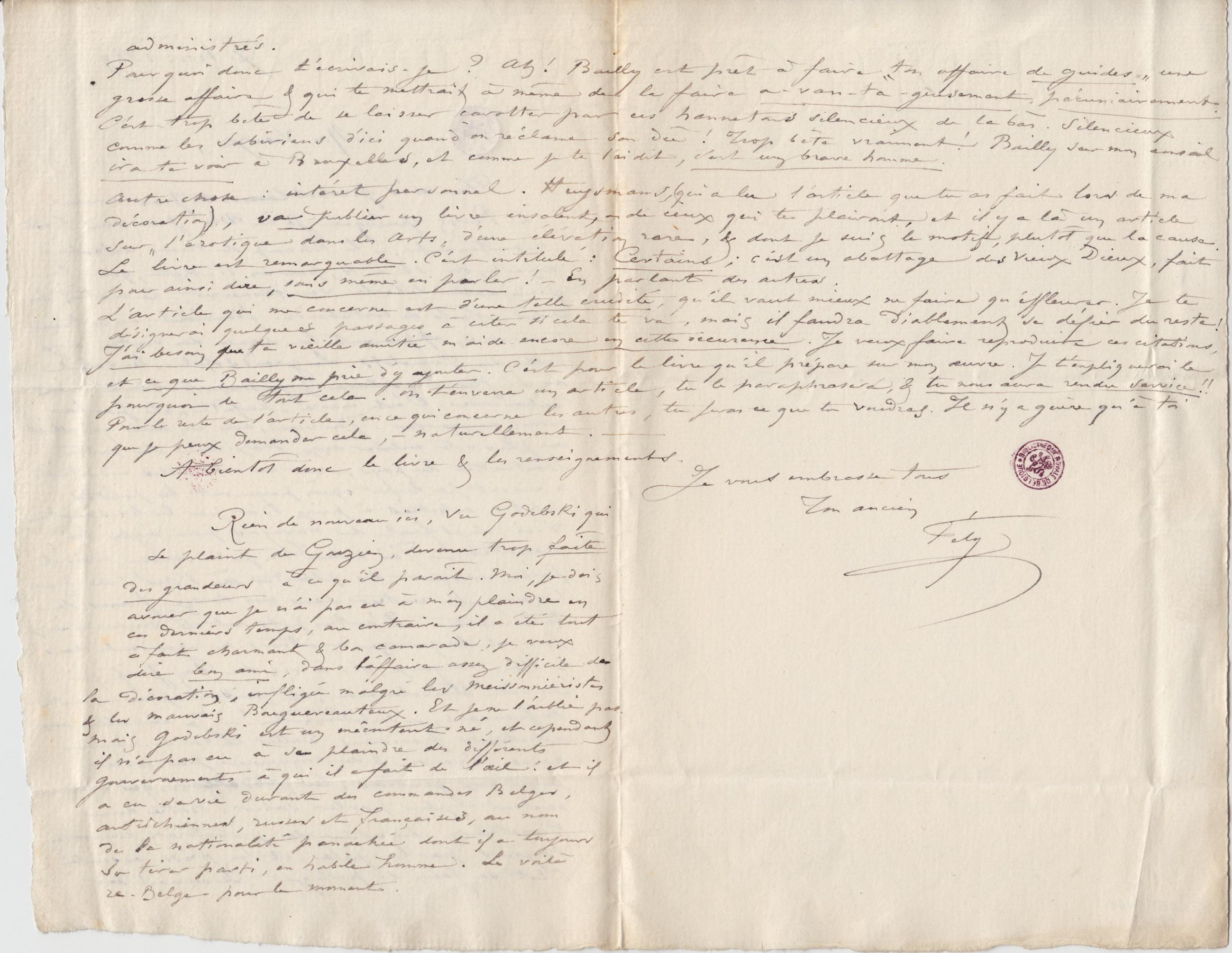 Pourquoi donc t’écrivais-je ? Ah ! Bailly est prêt à faire « ton affaire de guides » une grosse affaire & qui te mettrait à même de la faire a-van-ta-geusement, pécuniairement. C’est trop bête de se laisser carotter par ces hannetons silencieux de la bàs. Silencieux comme les Sabiriens d’ici quand on réclame son dû ! Trop bête vraiment ! Bailly sur mon conseil ira te voir à Bruxelles, et comme je te l’ai dit, c’est un brave homme.