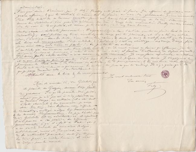 L’article qui me concerne est d’une telle crudité, qu’il vaut mieux ne faire qu’effleurer. Je te désignerai quelques passages à citer si cela te va, mais il faudra diablement se défier du reste ! J’ai besoin que ta vieille amitié m’aide encore en cette occurrence. Je veux faire reproduire ces citations, et ce que Bailly me prie d’y ajouter. C’est pour le livre qu’il prépare sur mon œuvre. Je t’expliquerai le pourquoi de tout cela. On t’enverra un article, tu le paraphrasera, & tu nous aura rendu service !! Pour le reste de l’article, en ce qui concerne les autres, tu feras ce que tu voudras. Il n’y a guère qu’à toi que je peux demander cela, – naturellement. –