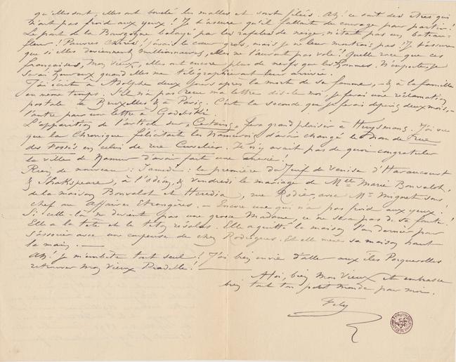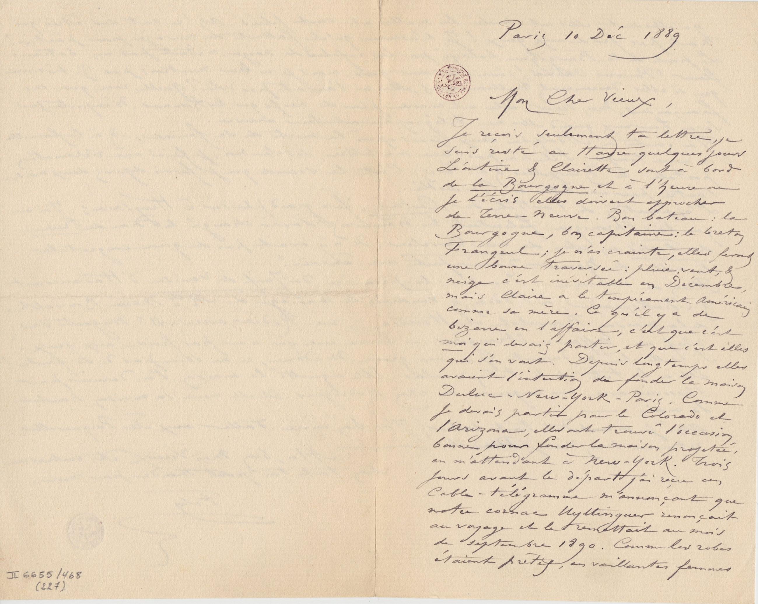 Je reçois seulement ta lettre, je suis resté au Havre quelques jours Léontine & Clairette sont à bord de la Bourgogne, et à l’heure où je t’écris elles doivent approcher de Terre Neuve. Bon bateau : la Bourgogne, bon capitaine : le breton Frangeul ; je n’ai crainte, elles feront une bonne traversée : pluie, vent, & neige c’est inévitable en Décembre, mais Claire a le tempérament Américain comme sa mère. Ce qu’il y a de bizarre en l’affaire, c’est que c’est moi qui devais partir, et que c’est elles qui s’en vont. Depuis longtemps elles avaient l’intention de fonder la maison Duluc-New-York-Paris. Comme je devais partir pour le Colorado et l’Arizona, elles ont trouvé l’occasion, bonne pour fonder la maison projetée, en m’attendant à New-York. Trois jours avant le départ j’ai reçu un Cable-télégramme m’annonçant que notre cornac Uyttinguer renonçait au voyage et le remettait au mois de septembre 1890. Comme les robes étaient prêtes, en vaillantes femmes