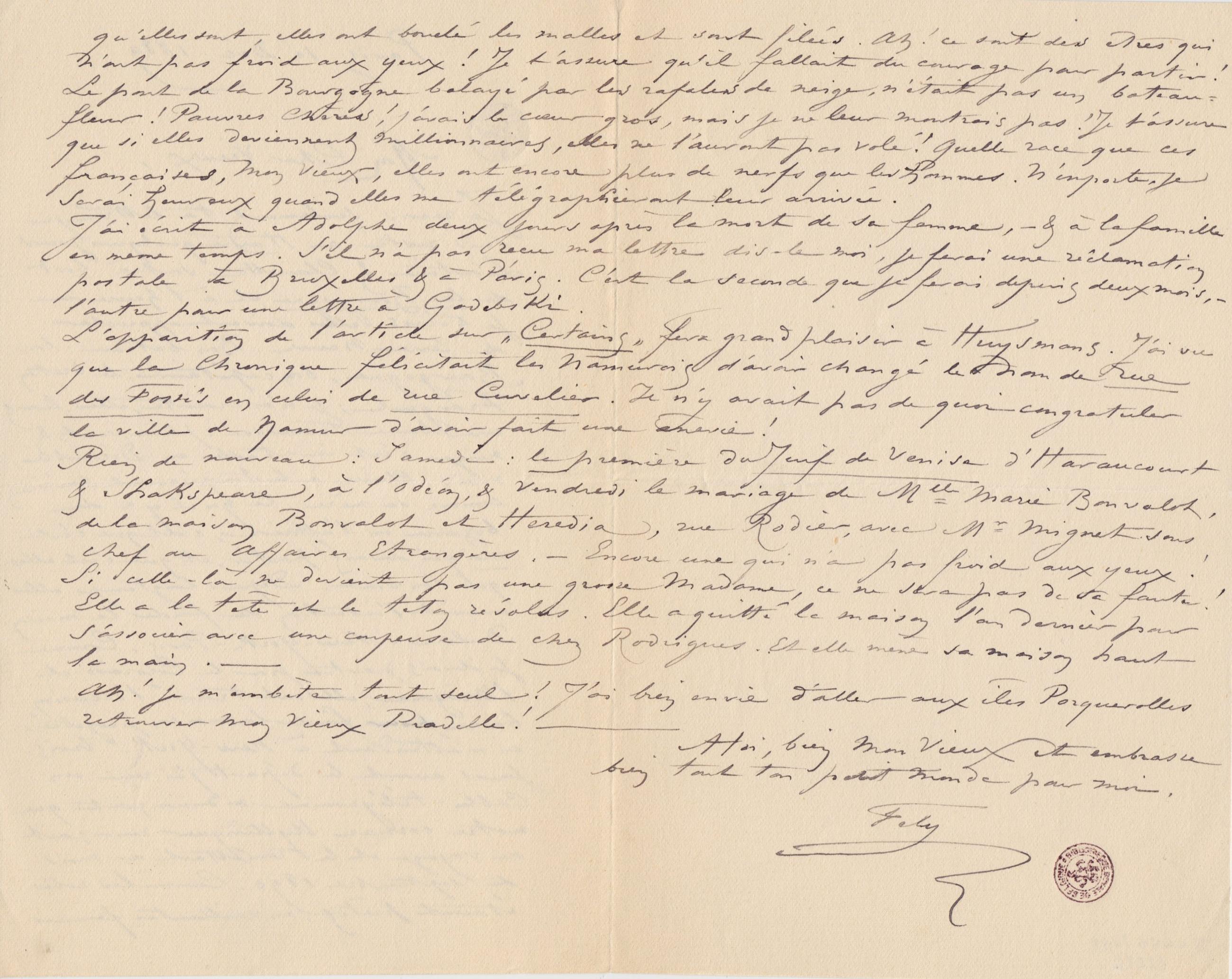 L’apparition de l’article sur « Certains » fera grand plaisir à Huysmans. J’ai vu que la Chronique félicitait les Namurois d’avoir changé le nom de rue des Fossés en celui de rue Cuvelier. Il n’y avait pas de quoi congratuler la ville de Namur d’avoir fait une ânerie !