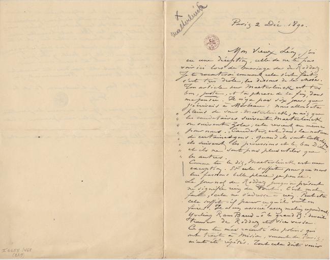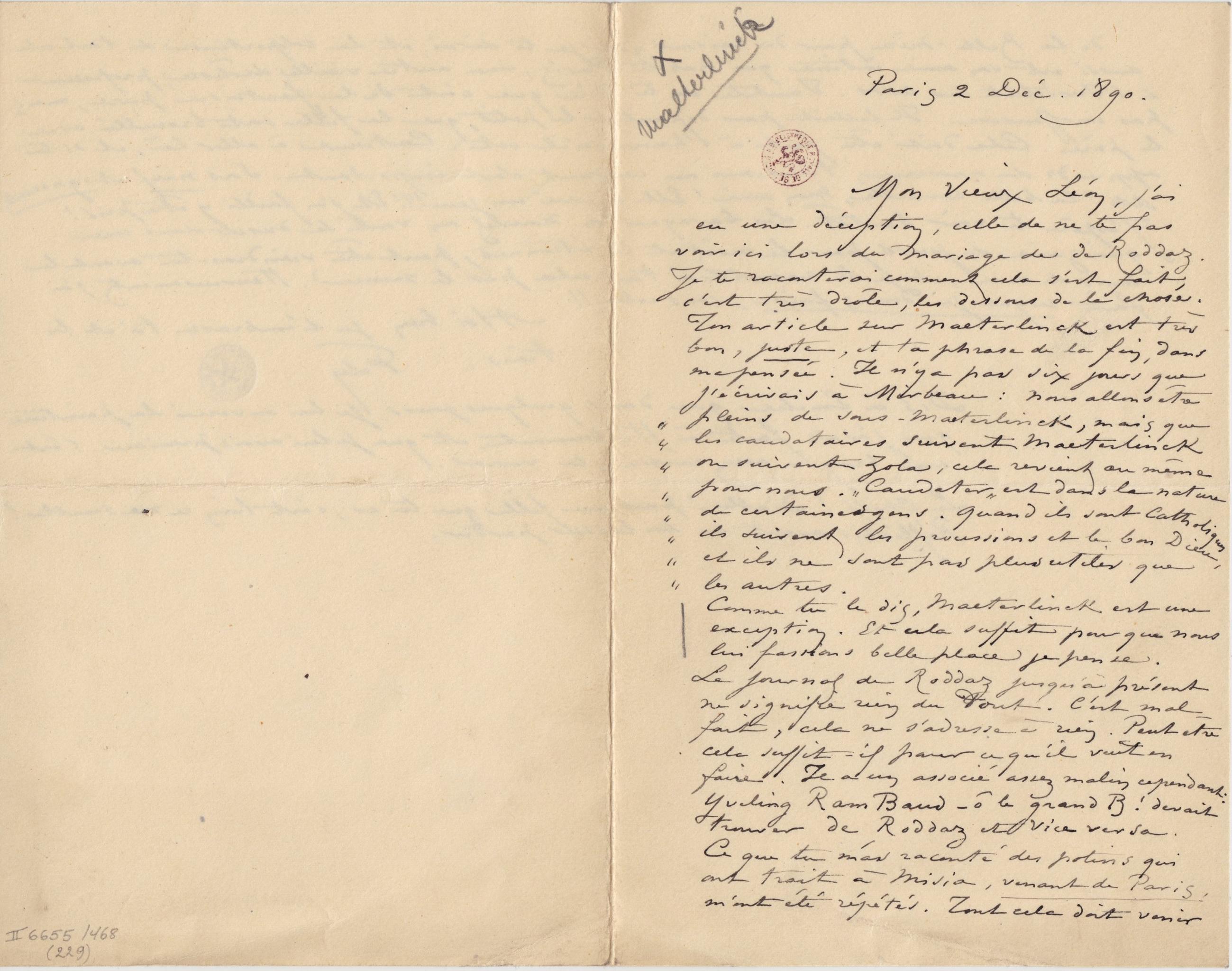 j’ai eu une déception, celle de ne te pas voir ici lors du mariage de de Roddaz. Je te raconterai comment cela s’est fait, c’est très drôle, les dessous de la chose. Ton article sur Maeterlinck est très bon, juste, et ta phrase de la fin, dans ma pensée. Il n’y a pas six jours que j’écrivais à Mirbeau : nous allons être « pleins de sous-Maeterlinck, mais que les caudataires suivent Maeterlinck ou suivent Zola, cela revient au même pour nous. “Caudater” est dans la nature de certaines gens. Quand ils sont catholiques ils suivent les processions et le bon Dieu, et ils ne sont pas plus utiles que les autres ».