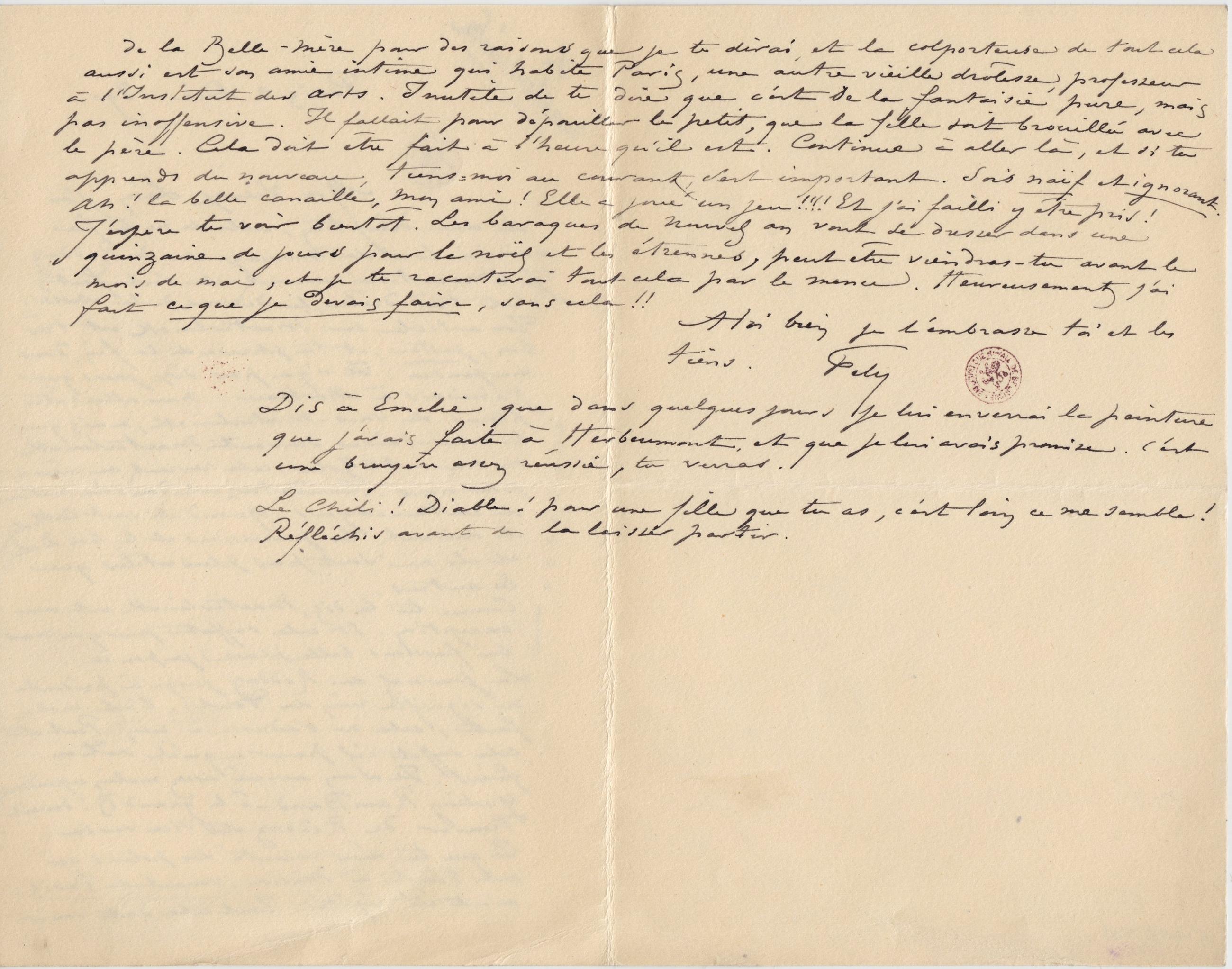 de la Belle-mère pour des raisons que je te dirai, et la colporteuse de tout cela aussi est son amie intime qui habite Paris, une autre vieille drôlesse, professeur à l’Institut des Arts. Inutile de te dire que c’est de la fantaisie pure, mais pas inoffensive. Il fallait pour dépouiller le petit, que la fille soit brouillée avec le père. Cela doit être fait à l’heure qu’il est. Continue à aller là, et si tu apprends du nouveau, tiens-moi au courant, c’est important. Sois naïf et ignorant. Ah ! la belle canaille, mon ami ! Elle a joué un jeu !!!! Et j’ai failli y être pris ! J’espère te voir bientôt. Les baraques de Nouvel An vont se dresser dans une quinzaine de jours pour la noël et les étrennes, peut être viendras-tu avant le mois de mai, et je te raconterai tout cela par le menu. Heureusement j’ai fait ce que je devais faire, sans cela !!