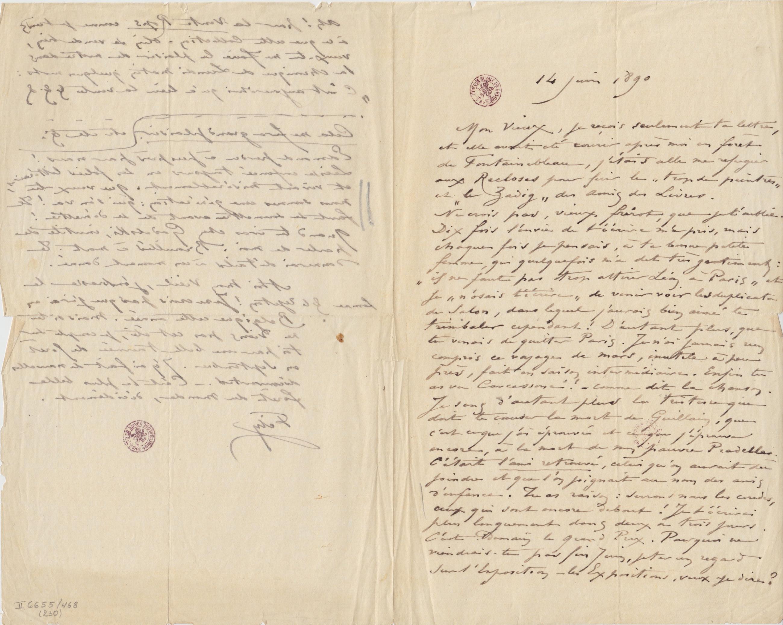 je reçois seulement ta lettre, et elle avait été courir après moi en forêt de Fontainebleau, j’étais alle me refugier aux Recloses pour fuir le « trop de peintres » et « le Zadig » des Amis des Livres.