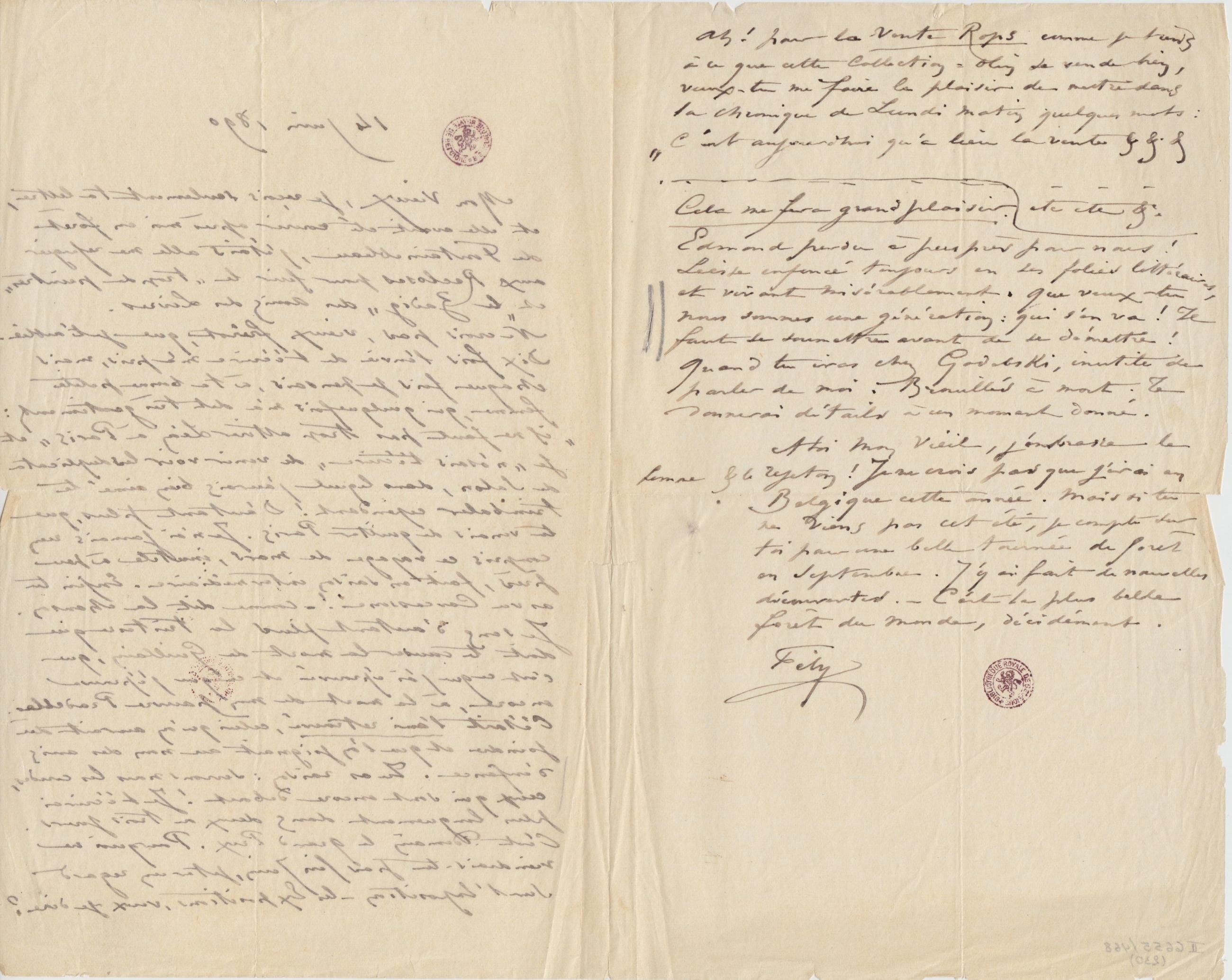 Ah ! pour la vente Rops comme je tiens à ce que cette Collection-Olin se vende bien, veux-tu me faire le plaisir de mettre dans la chronique de Lundi matin quelques mots : « C’est aujourdhui qu’a lieu la vente & &. &…………. etc etc &cCela me fera grand plaisir. Edmond perdu à peu près pour nous ! Liesse enfoncé toujours en ses folies littéraires, et vivant misérablement. Que veux-tu nous sommes une génération : qui s’en va ! Il faut se soumettre avant de se démettre ! Quand tu iras chez Godebski, inutile de parler de moi. Brouillés à mort. Te donnerai détails à un moment donné.