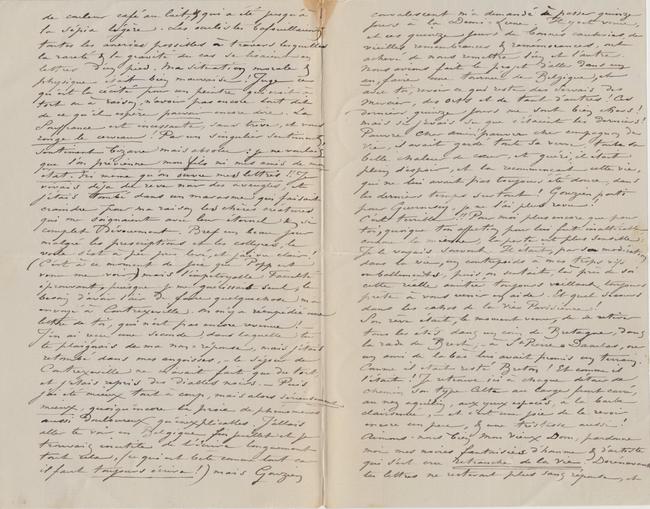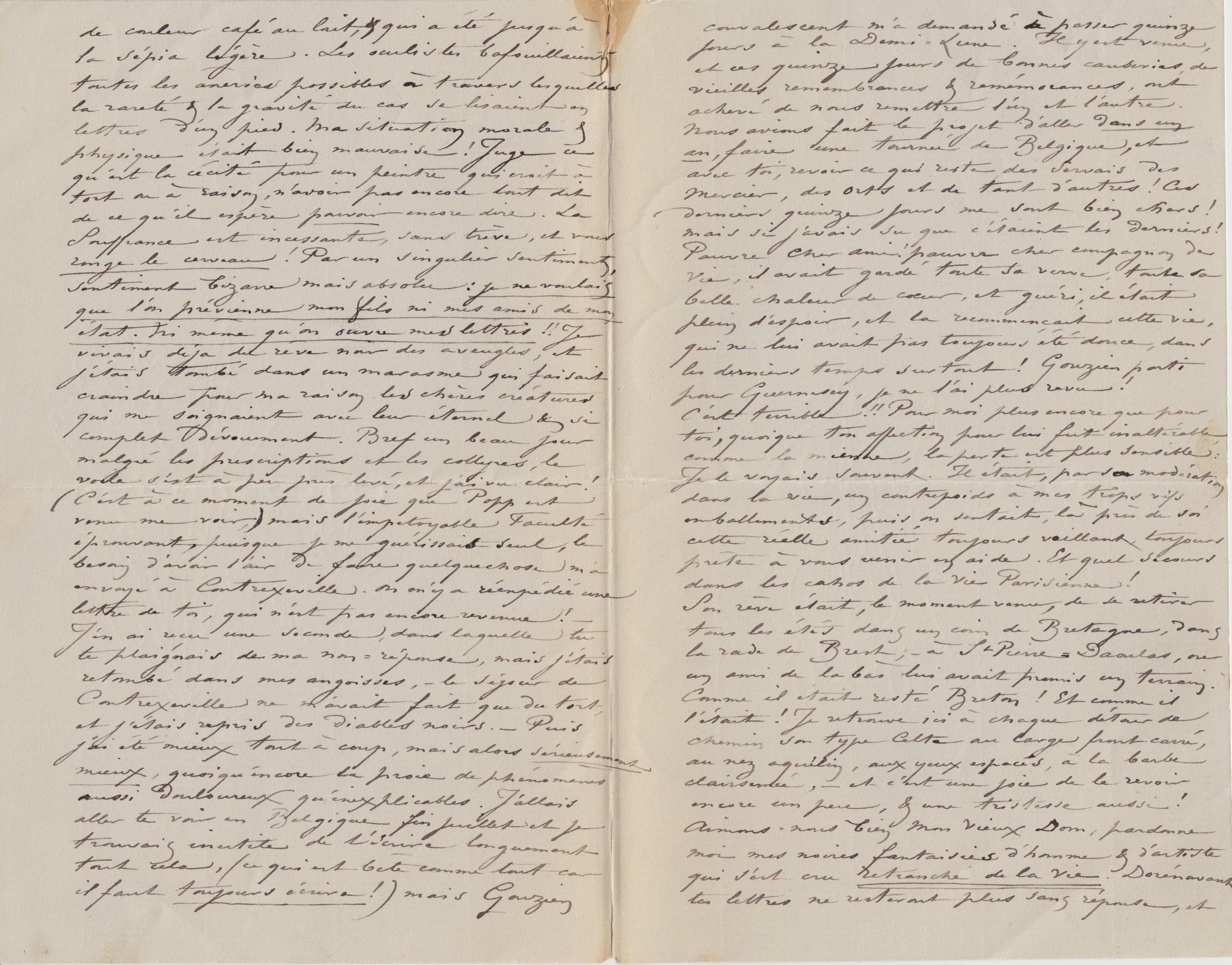 de couleur café au lait, & qui a été jusqu’à la sépia légère. Les oculistes bafouillaient toutes les âneries possibles à travers lesquelles la rareté & la gravité du cas se lisaient en lettres d’un pied. Ma situation morale & physique était bien mauvaise ! Juge ce qu’est la cécité pour un peintre qui croit à tort ou à raison, n’avoir pas encore tout dit de ce qu’il espère pouvoir encore dire. La Souffrance est incessante, sans trève, et vous ronge le cerveau ! Par un singulier sentiment, sentiment bizarre mais absolu : je ne voulais que l’on prévienne mon fils ni mes amis de mon état. Ni même qu’on ouvre mes lettres !! Je vivais déja du rêve noir des aveugles, et j’étais tombé dans un marasme qui faisait craindre pour ma raison les chères créatures qui me soignaient avec leur éternel & si complet dévouement. Bref un beau jour malgré les prescriptions et les collyres, le voile s’est à peu près levé, et j’ai vu clair ! (C’est à ce moment de joie que Popp est venu me voir,) mais l’impitoyable Faculté éprouvant, puisque je me guérissais seul, le besoin d’avoir l’air de faire quelquechose m’a envoyé à Contrexeville. On m’y a réexpédié une lettre de toi, qui n’est pas encore revenue ! – J’en ai reçu une seconde, dans laquelle tu te plaignais de ma non-réponse, mais j’étais retombé dans mes angoisses, – le séjour de Contrexeville ne m’avait fait que du tort, et j’étais repris des diables noirs. – Puis j’ai été mieux tout à coup, mais alors sérieusement mieux, quoiqu’encore la proie de phénomènes aussi douloureux qu’inexplicables. J’allais aller te voir en Belgique fin juillet et je trouvais inutile de t’écrire longuement tout cela, (ce qui est bête comme tout car il faut toujours écrire !) mais Gouzien