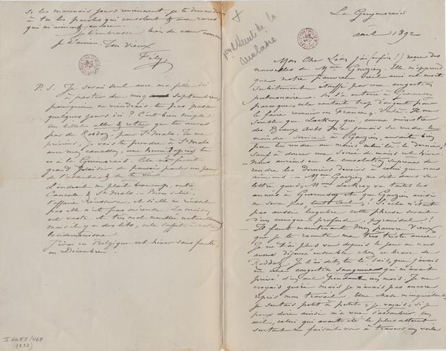 P.S. Je serai seul avec ma fille ici à partir du cinq aout septembre, pourquoi ne viendrais-tu pas passer quelques jours ici ? C’est bien simple : un billet aller & retour que tu auras par de Roddaz, pour St Malo. Tu me préviens, je vais te prendre à St Malo avec mon canasson, une heure ½ après tu es à la Guymorais. Cela me ferait grand plaisir de pouvoir parler un peu de l’absent, & de te voir.