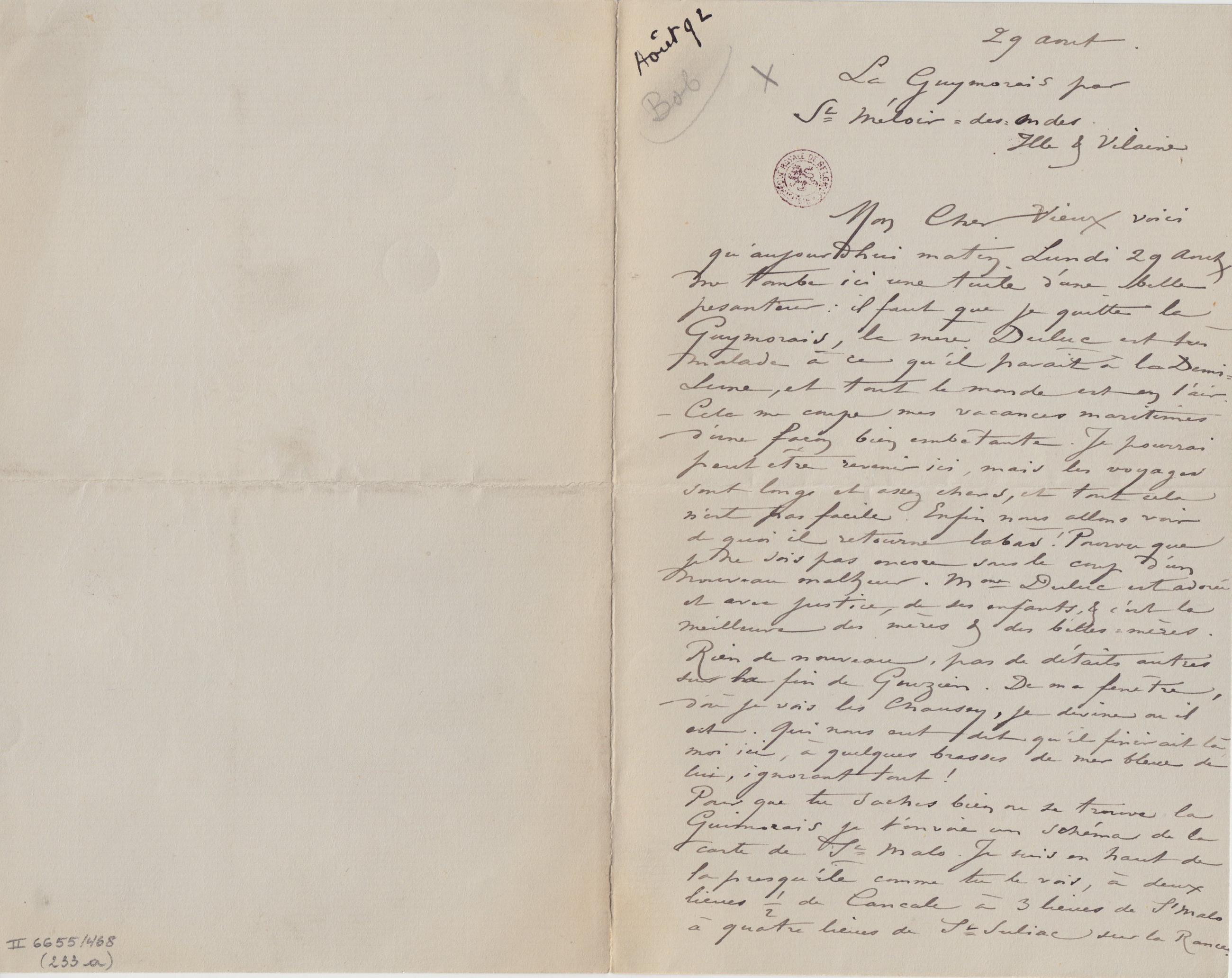 voici qu’aujourdhui matin Lundi 29 Aout, me tombe ici une tuile d’une belle pesanteur : il faut que je quitte la Guymorais, la mère Duluc est très malade à ce qu’il paraît à la Demi-Lune, et tout le monde est en l’air. – Cela me coupe mes vacances maritimes d’une façon bien embêtante. Je pourrai peut être revenir ici, mais les voyages sont longs et assez chers, et tout cela n’est pas facile. Enfin nous allons voir de quoi il retourne labàs ! Pourvu que je ne sois pas encore sous le coup d’un nouveau malheur. Mme Duluc est adorée et avec justice, des ses enfants, & c’est la meilleure des mères & des belles-mères. Rien de nouveau, pas de détails autres sur la fin de Gouzien. De ma fenêtre, d’où je vois les Chausey, je devine où il est. Qui nous eut dit qu’il finirait là, moi ici, à quelques brasses de mer bleue de lui, ignorant tout !
