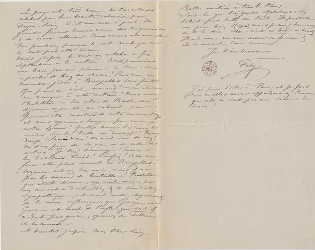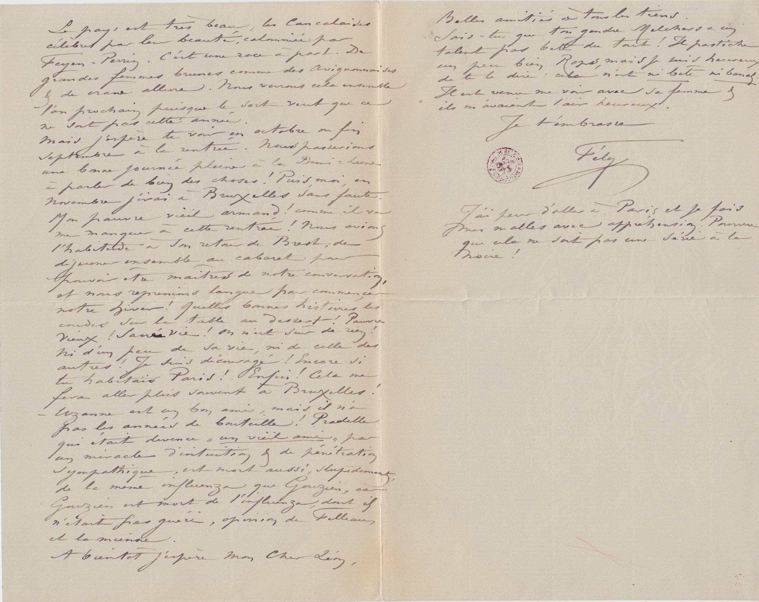 Cette lettre que Rops date du 22 août évoque la mort de son ami Armand Gouzien décédé le 14 août 1892. Elle suit deux autres lettres, voir : inv. II/6655/468/231 et 232. – N° d’édition : 2810 et 2811.