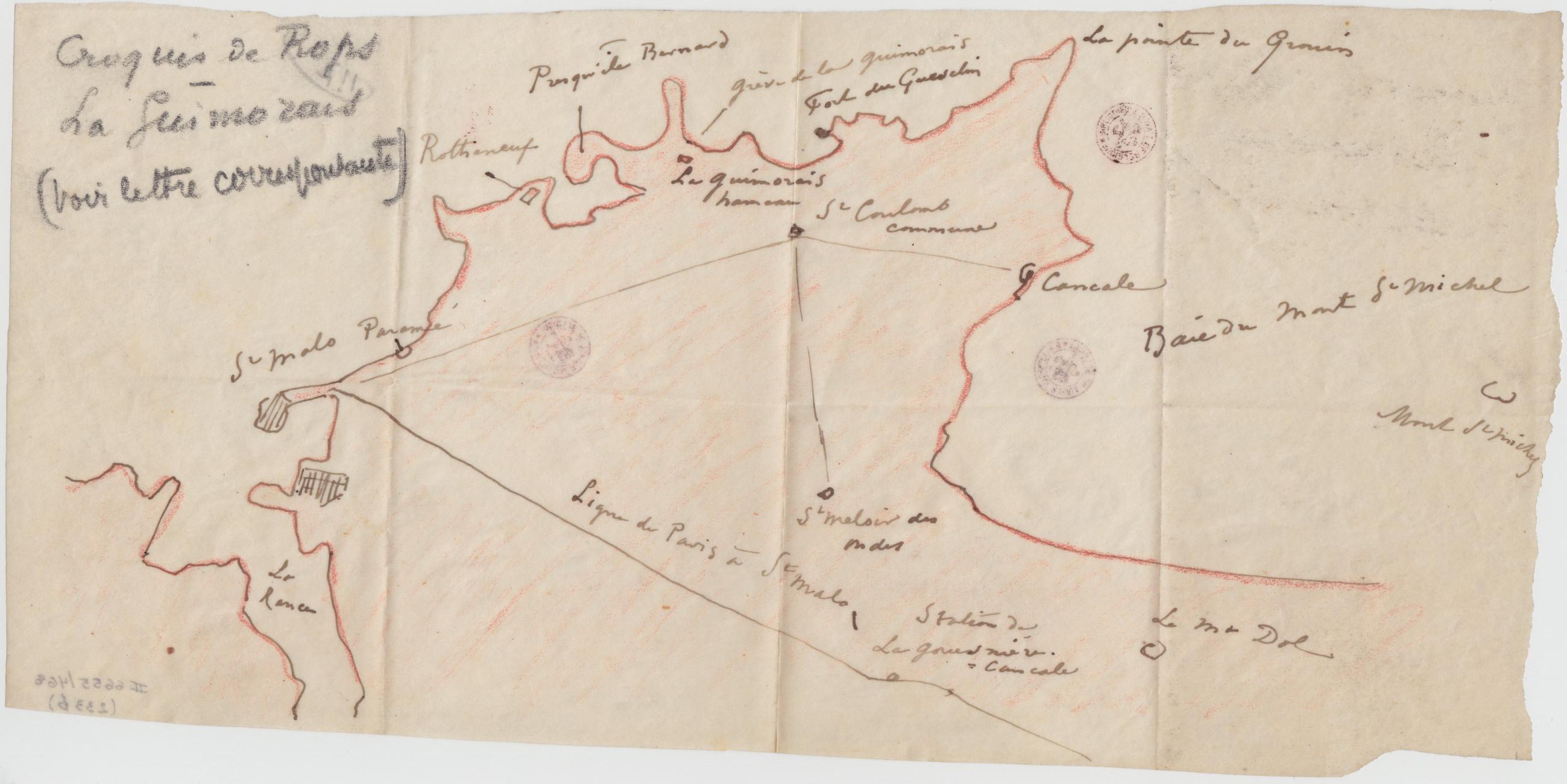 Pour que tu saches bien où se trouve la Guimorais je t’envoie un schéma de la carte de St Malo. Je suis en haut de la presqu’île comme tu le vois, à deux lieues ½ de Cancale à 3 lieues de St Malo à quatre lieues de St Suliac sur la Rance.