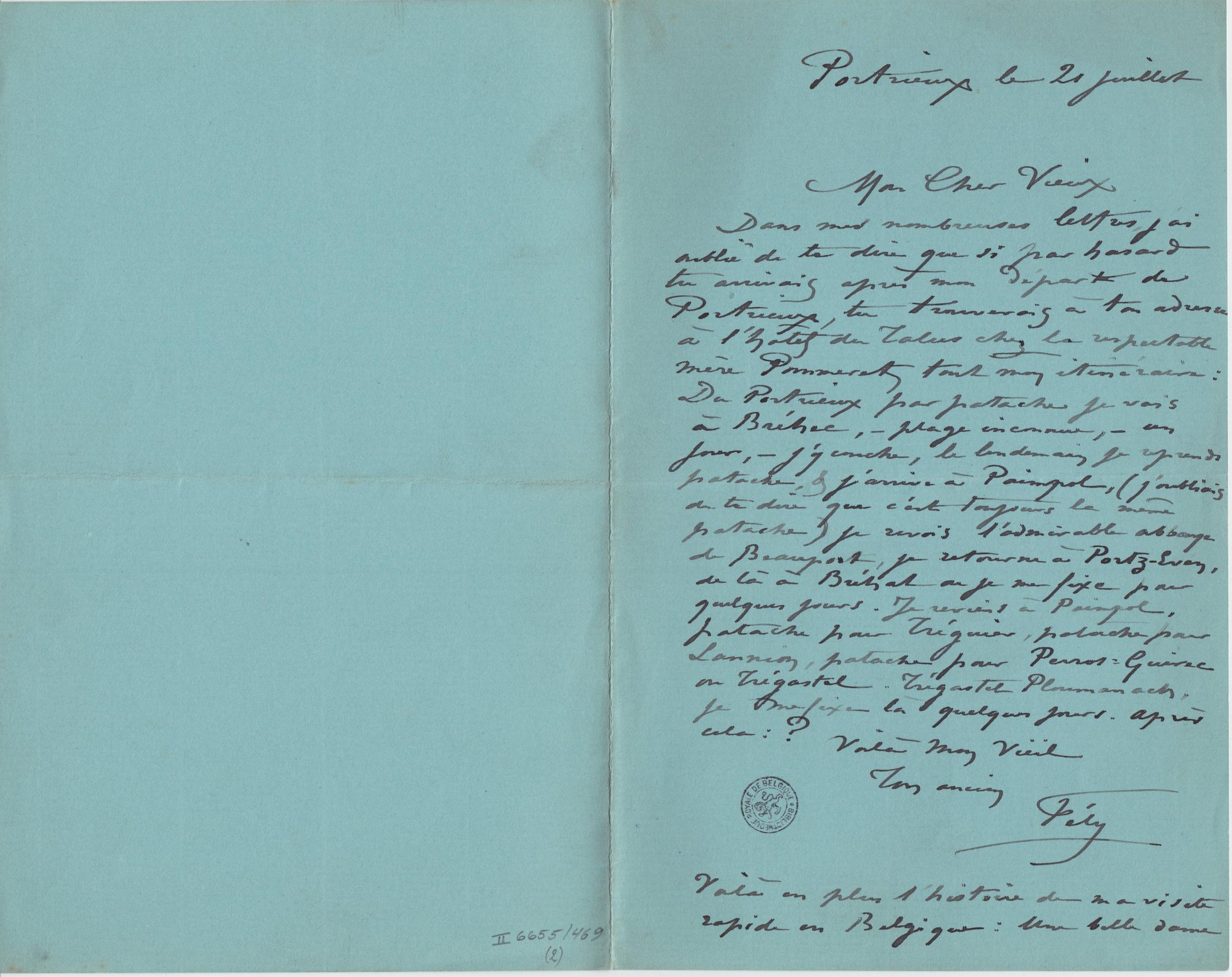 Dans mes nombreuses lettres, j’ai oublié de te dire que si par hasard tu arrivais après mon départ de Portrieux, tu trouverais à ton adresse à l’hôtel du Talus chez la respectable mère Pommeret tout mon itinéraire : Du Portrieux par patache je vais à Bréhec, – plage inconnue, – un jour, – j’y couche, le lendemain je reprends patache, & j’arrive à Paimpol, (j’oubliais de te dire que c’est toujours la même patache) je revois l’admirable abbaye de Beauport, je retourne à Portz-Even, de là à Brehat où je me fixe pour quelques jours. Je reviens à Paimpol, patache pour Tréguier, patache pour Lannion, patache pour Perros-Guirec ou Trégastel. TrégastelPloumanach, je me fixe là quelques jours. Après cela :?