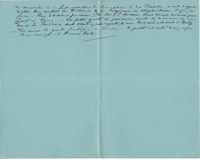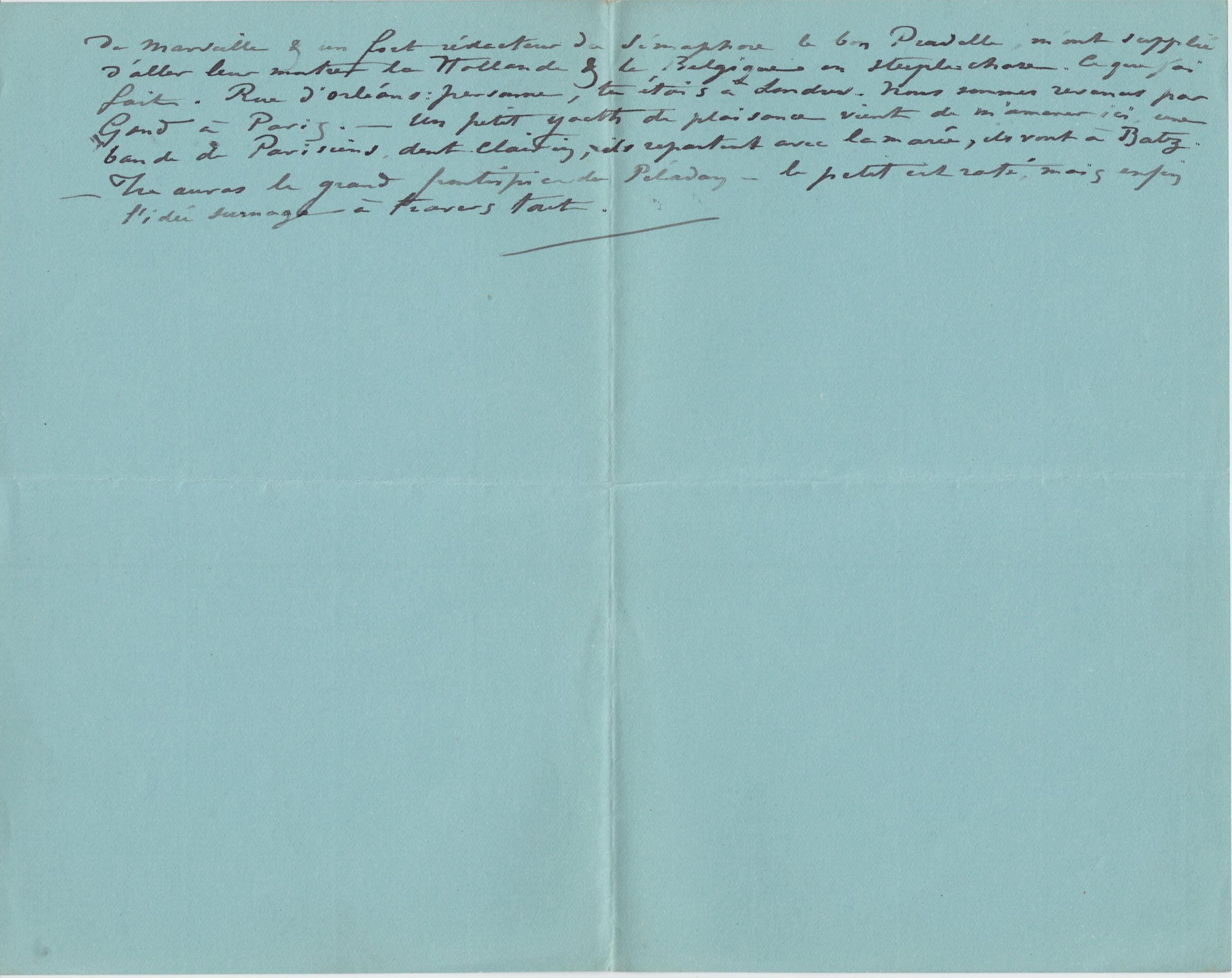 de Marseille & un fort rédacteur du sémaphore le bon Pradelle, m’ont supplié d’aller leur montrer la Hollande & la Belgique en steeple-chase. Ce que j’ai fait. Rue d’Orléans : personne, tu étais à Londres. Nous sommes revenus par Gand à Paris. – Un petit yacth de plaisance vient de m’amener ici, une bande de Parisiens, dont Clairin, ils repartent avec la marée, ils vont à Batz. – Tu auras le grand frontispice de Péladan – le petit est raté, mais enfin l’idée surnage à travers tout.