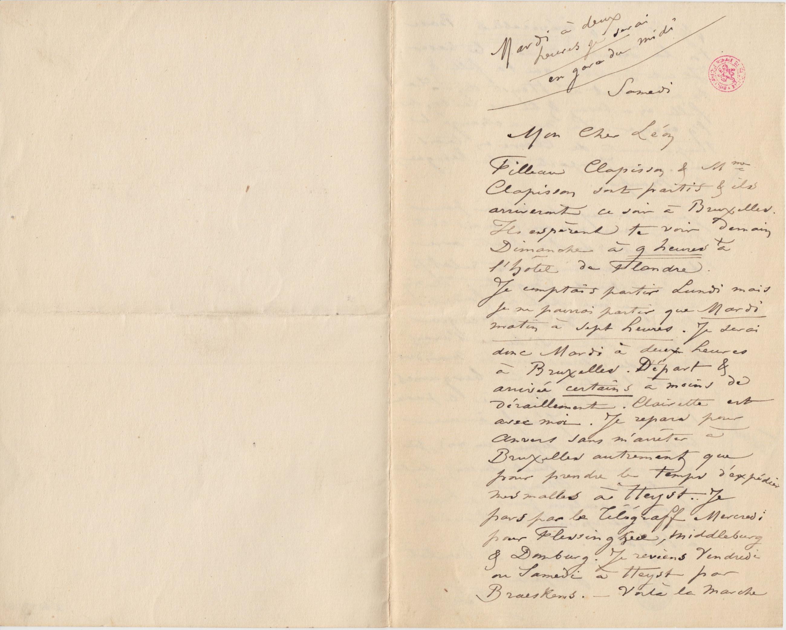 FilleauClapisson & Mme Clapisson sont partis & ils arriveront ce soir à Bruxelles. Ils espèrent te voir demain Dimanche à 9 heures à l’hôtel de Flandre.