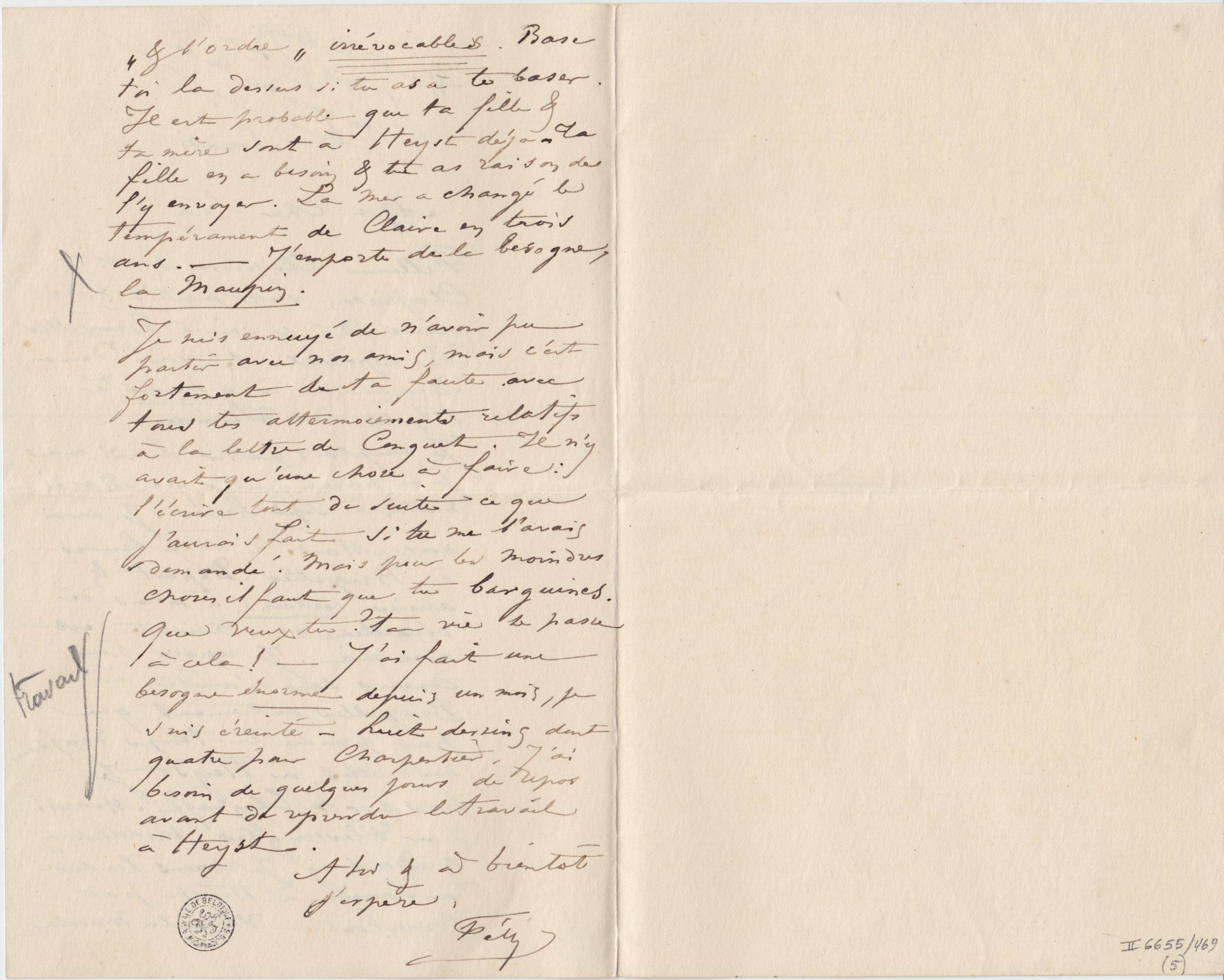 Je comptais partir Lundi mais je ne pourrai partir que Mardi matin à sept heures. Je serai donc Mardi à deux heures à Bruxelles. Départ & arrivée certains à moins de déraillement. Clairette est avec moi. Je repars pour Anvers sans m’arrêter à Bruxelles autrement que pour prendre le temps d’expédier mes malles à Heyst. Je pars par le Télégraff Mercredi pour Flessing, Middleburg & Domburg. Je reviens Vendredi ou Samedi à Heyst par Braeskens. – Voilà la marche