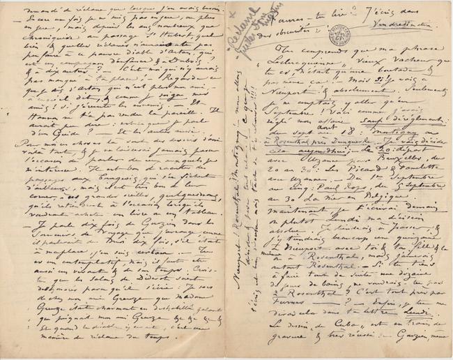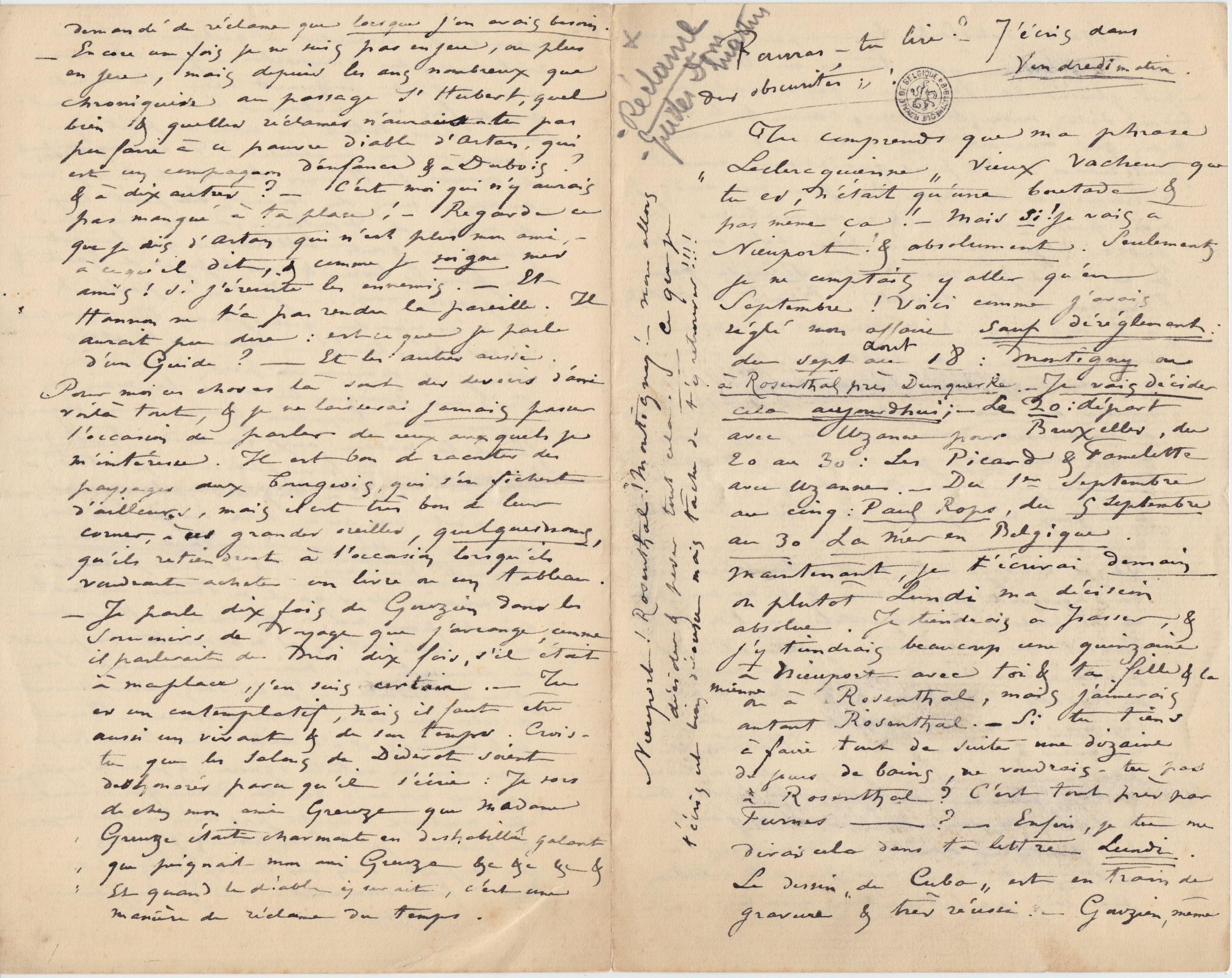 Maintenant, je t’écrirai demain ou plutôt Lundi ma décision absolue. Je tiendrais à passer, & j’y tiendrais beaucoup une quinzaine à Nieuport avec toi & ta fille & la mienne ou à Rosenthal, mais j’aimerais autant Rosenthal. – Si tu tiens à faire tout de suite une dizaine de jours de bains, ne voudrais-tu pas à Rosenthal ? C’est tout près par Furnes – ? – Enfin, je tu me diras cela dans ta lettre Lundi.