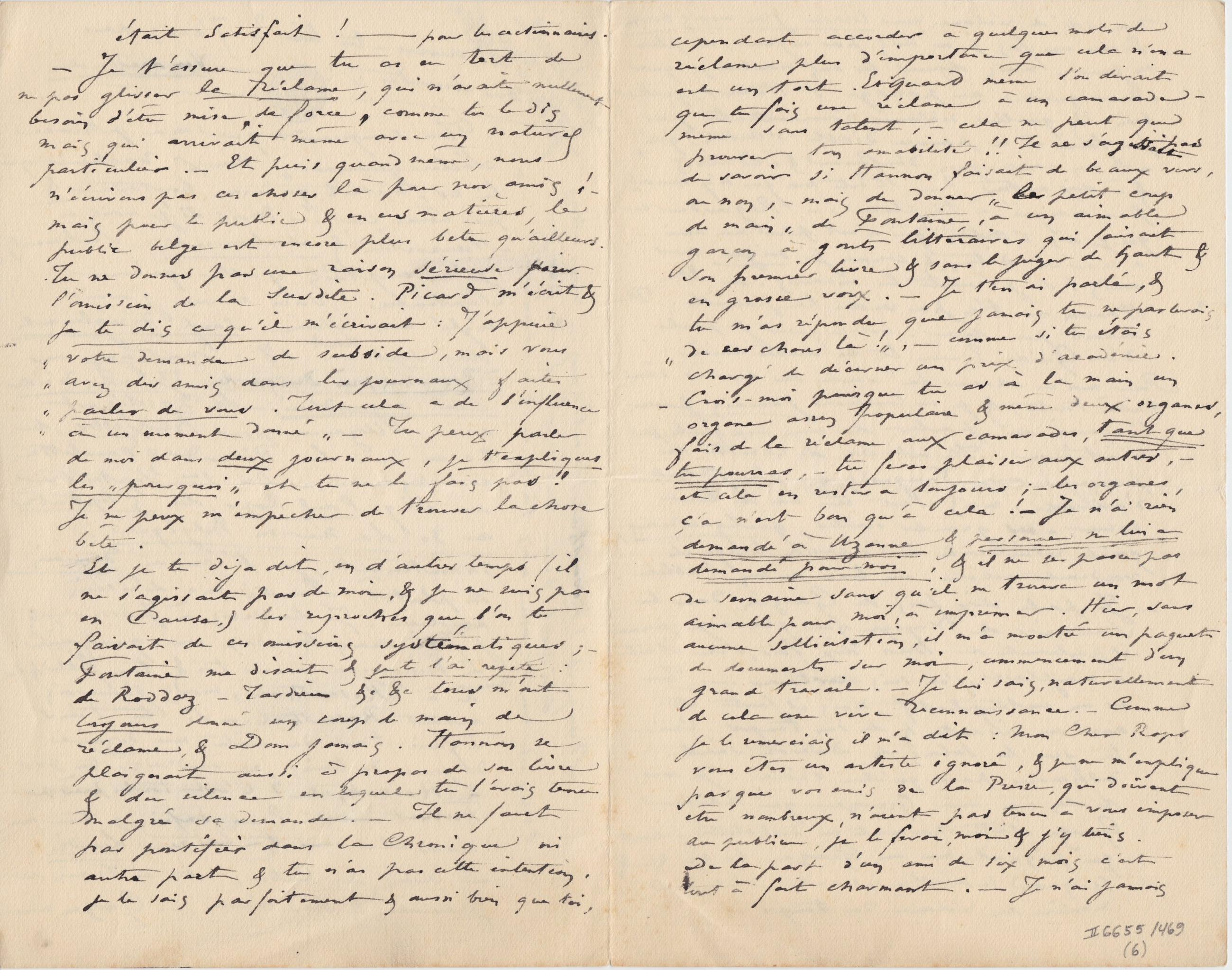 – Je t’assure que tu as eu tort de ne pas glisser la réclame, qui n’avait nullement besoin d’être mise « de force » comme tu le dis mais qui arrivait même avec un naturel particulier. – Et puis quand même, nous n’écrivons pas ces choses là pour nos amis ! – mais pour le public & en ces matières, le public belge est encore plus bête qu’ailleurs. Tu ne donnes pas une raison sérieuse pour l’omission de la susdite. Picard m’écrit & je te dis ce qu’il m’écrivait : « J’appuie votre demande de subside, mais vous avez des amis dans les journaux faites parler de vous. Tout cela a de l’influence à un moment donné » – Tu peux parler de moi dans deux journaux, je t’expliques les « pourquoi » et tu ne le fais pas ! Je ne peux m’empêcher de trouver la chose bête.