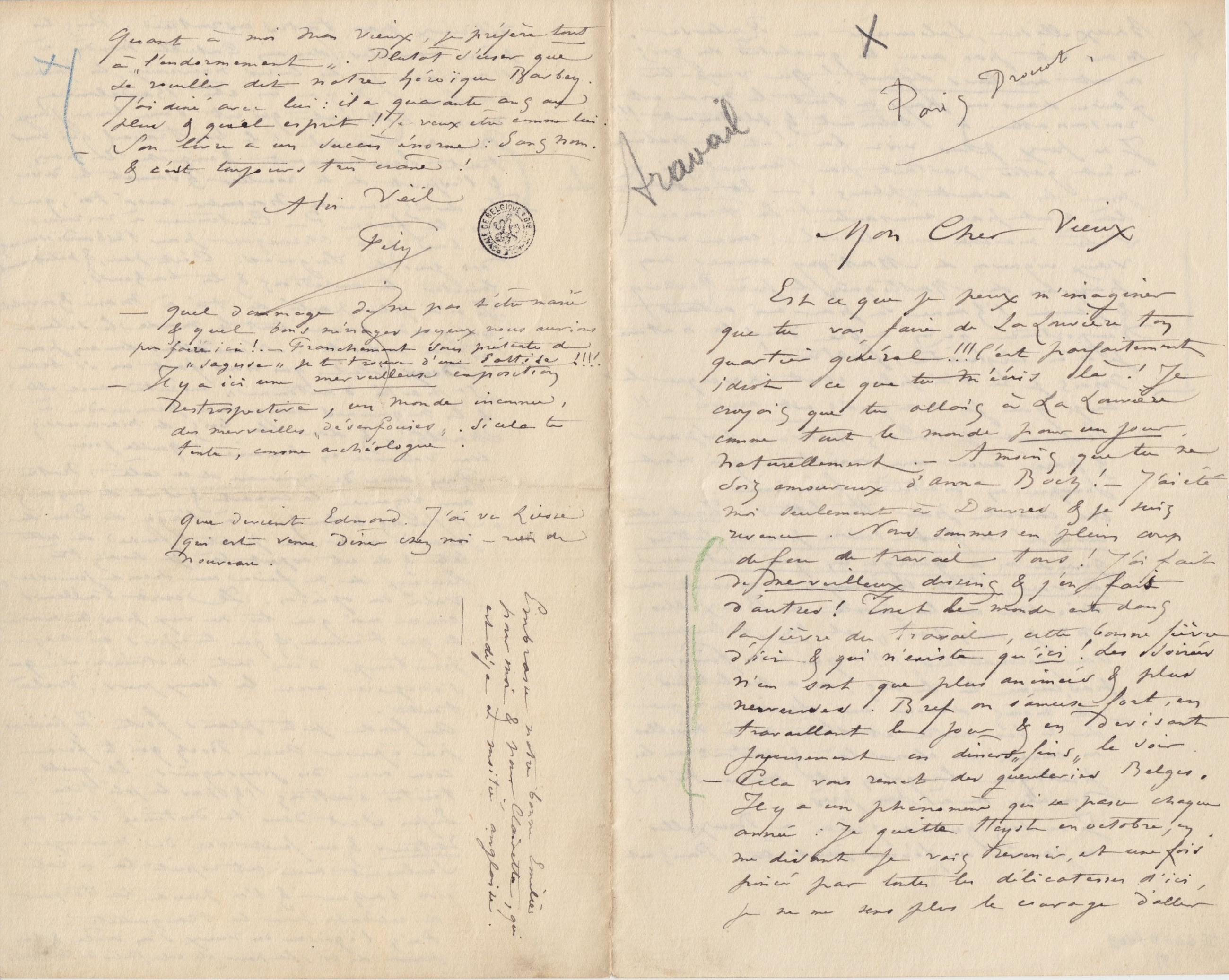 Un conseil pour tes lettres : Tout être civilisé se fait suivre par ses lettres quand on a quelqu’un qui s’intéresse à vous. C’est très simple : on écrit au directeur de la poste de Bruxelles : « Mr je suis là » et là, le lendemain « sans formalités » (!!!) qui n’en finissent pas, comme tu le dis, on a ses lettres.