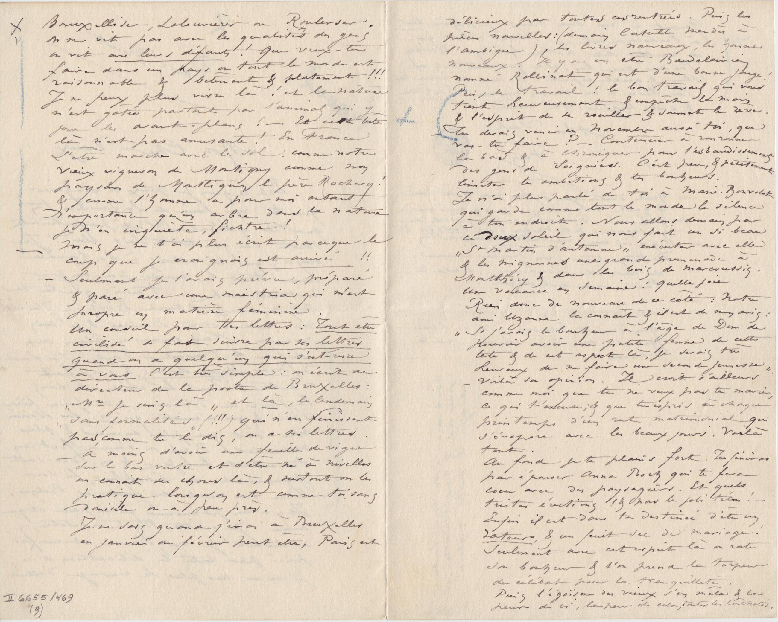 Bruxelliser, Lalouvièrer ou Roulerser. On ne vit pas avec les qualités des gens on vit avec leurs défauts ! Que veux-tu faire dans un pays où tout le monde est raisonnable & bêtement & platement !!! Je ne peux plus vivre là ! et la nature n’est gâtée partout par l’animal qui y joue les avant-plans ! – Et cette bête là n’est pas amusante ! En France L’être marche avec le sol. comme notre vieux vigneron de Montigny comme mon paysan de Montlignon le père Rochery ! & comme l’homme a pour moi autant d’importance qu’un arbre dans la nature je m’en inquiète, fichtre !