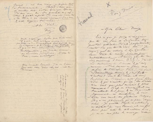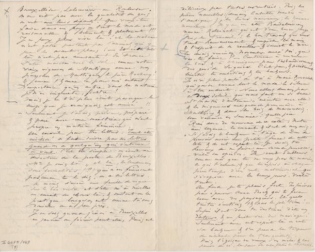 Est ce que je peux m’imaginer que tu vas faire de La Louvière ton quartier général !!! C’est parfaitement idiot ce que tu m’écris là ! Je croyais que tu allais à La Louvière comme tout le monde pour un jour, naturellement. – À moins que tu ne sois amoureux d’Anna Boch ! – J’ai été moi seulement à Douvres & je suis revenu. Nous sommes en plein coup de feu de travail tous ! J’ai fait de merveilleux dessins & j’en fais d’autres ! Tout le monde est dans la fièvre du travail, cette bonne fièvre d’ici & qui n’existe qu’ici ! Les soirées n’en sont que plus animées & plus nerveuses. Bref on s’amuse fort, en travaillant le jour & en devisant joyeusement en dîners « fins » le soir.