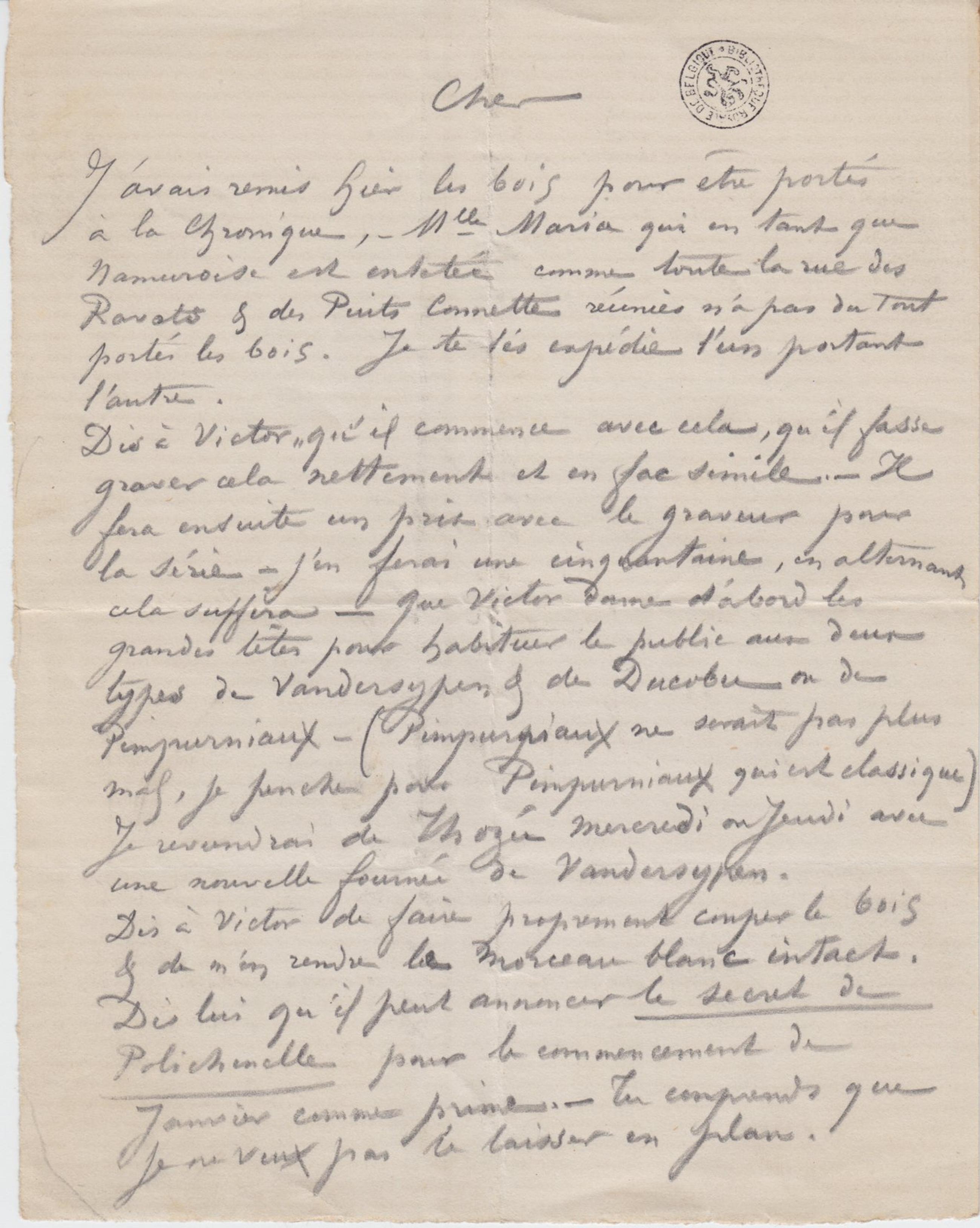 J’avais remis hier les bois pour être portés à la Chronique, – Mlle Maria qui en tant que Namuroise est entetée comme toute la rue des Ravati & des Puits Connette réunies n’a pas du tout portés les bois. Je te l’es expédie l’un portant l’autre.