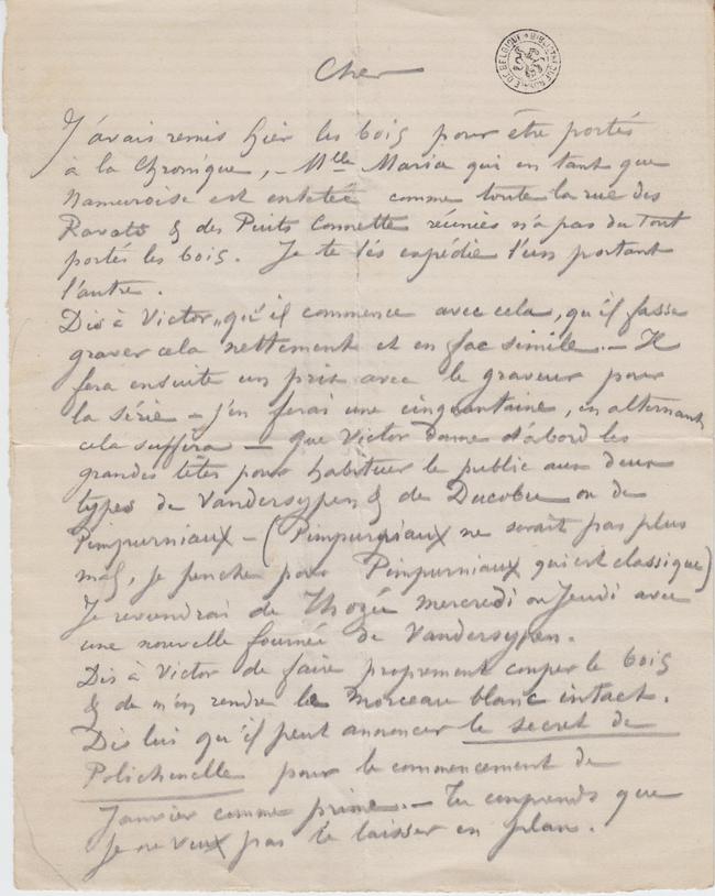 Dis à Victor de faire proprement couper le bois & de m’en rendre le morceau blanc intact. Dis lui qu’il peut annoncer le Secret de Polichinelle pour le commencement de Janvier comme prime. – Tu comprends que je ne veux pas le laisser en plan.