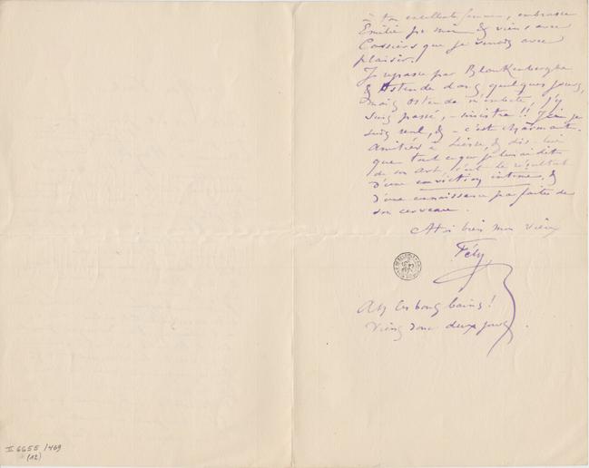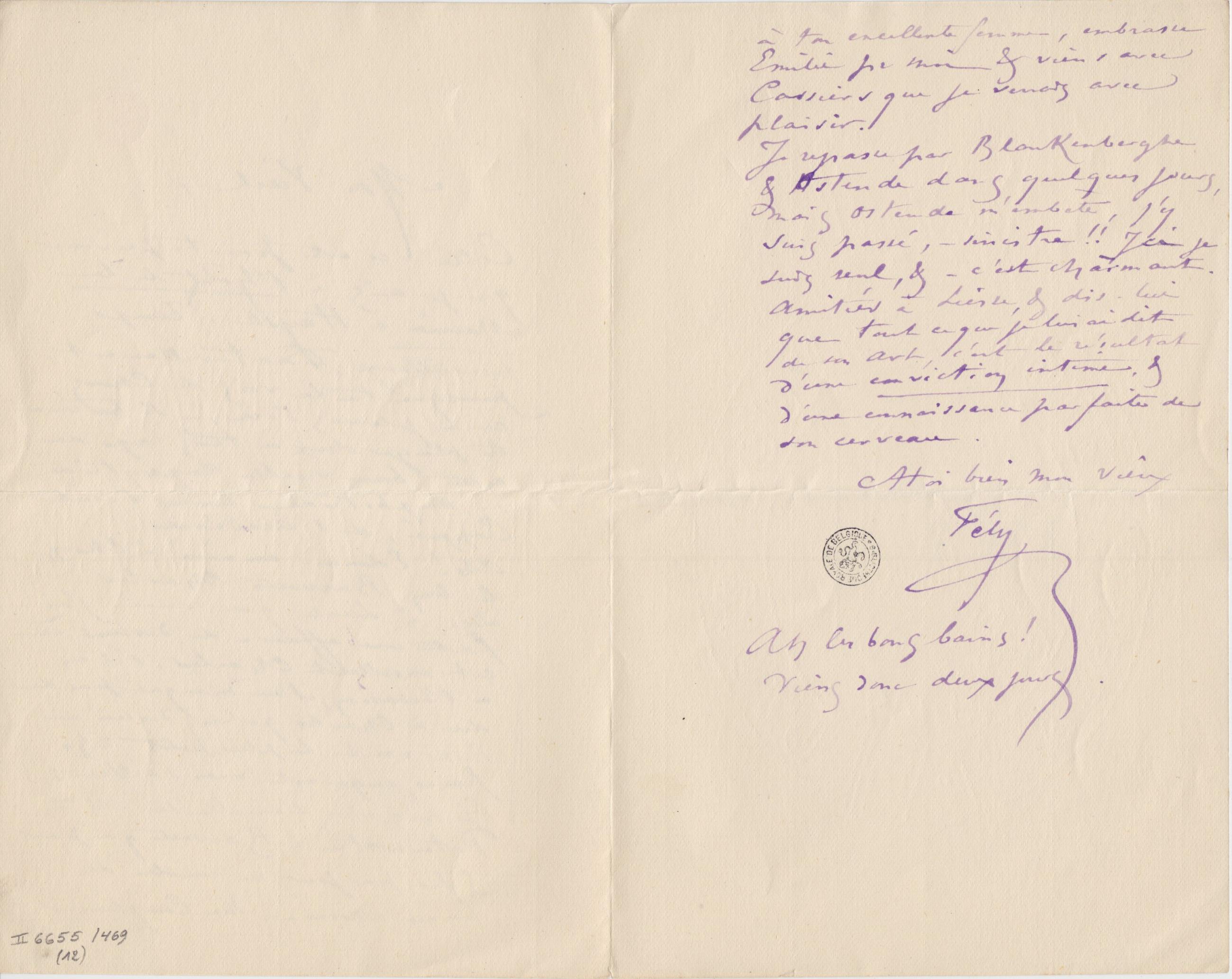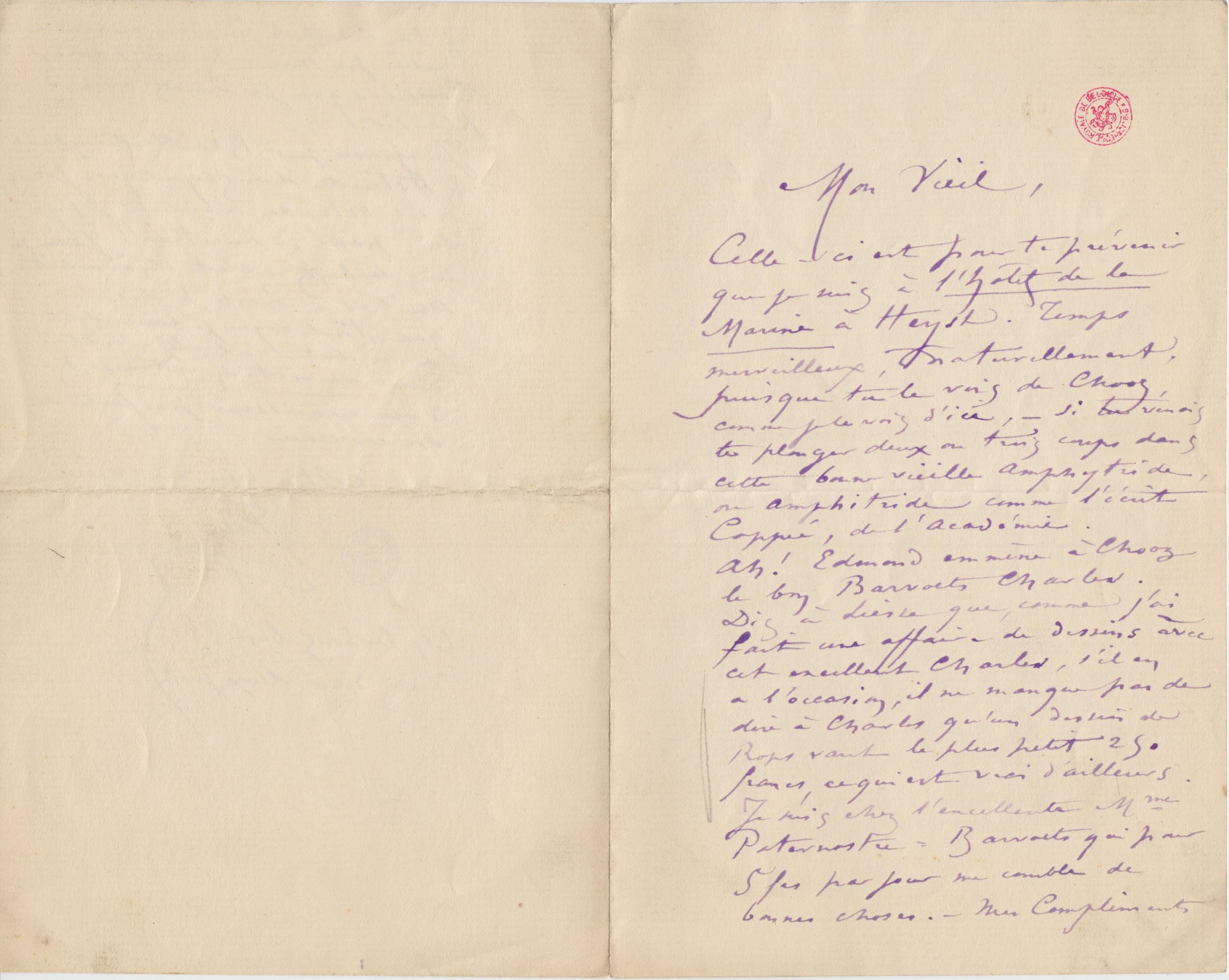 Ah ! Edmond emmène à Chooz le bon Barvoets Charles. Dis à Liesse que, comme j’ai fait une affaire de dessins avec cet excellent Charles, s’il en a l’occasion, il ne manque pas de dire à Charles qu’un dessin de Rops vaut le plus petit 250 francs, ce qui est vrai d’ailleurs.