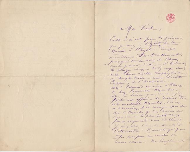 Celle-ci est pour te prévenir que je suis à l’hôtel de la Marine à Heyst. Temps merveilleux, naturellement, puisque tu le vois de Chooz, comme je le vois d’ici, – si tu venais te plonger deux ou trois coups dans cette bonne vieille amphytride, ou amphitride comme l’écrit Coppée, de l’Académie.