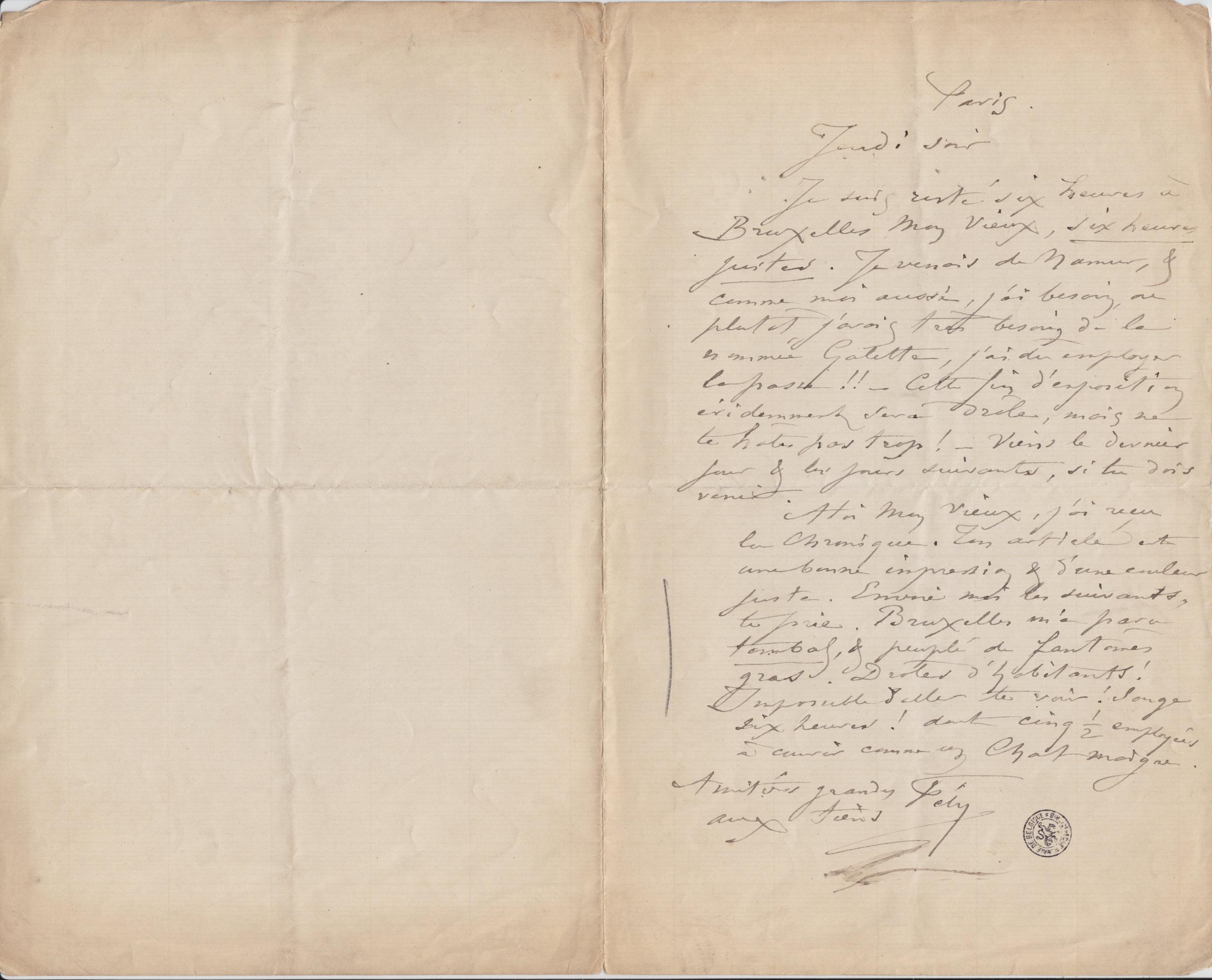 À toi Mon Vieux, j’ai reçu la Chronique. Ton article est une bonne impression & d’une couleur juste. Envoie moi les suivants, te prie. Bruxelles m’a paru tombal, & peuplé de fantômes gras. Drôles d’habitants ! Impossible d’aller te voir ! Songe six heures ! dont cinq ½ employées à courir comme un Chat maigre.