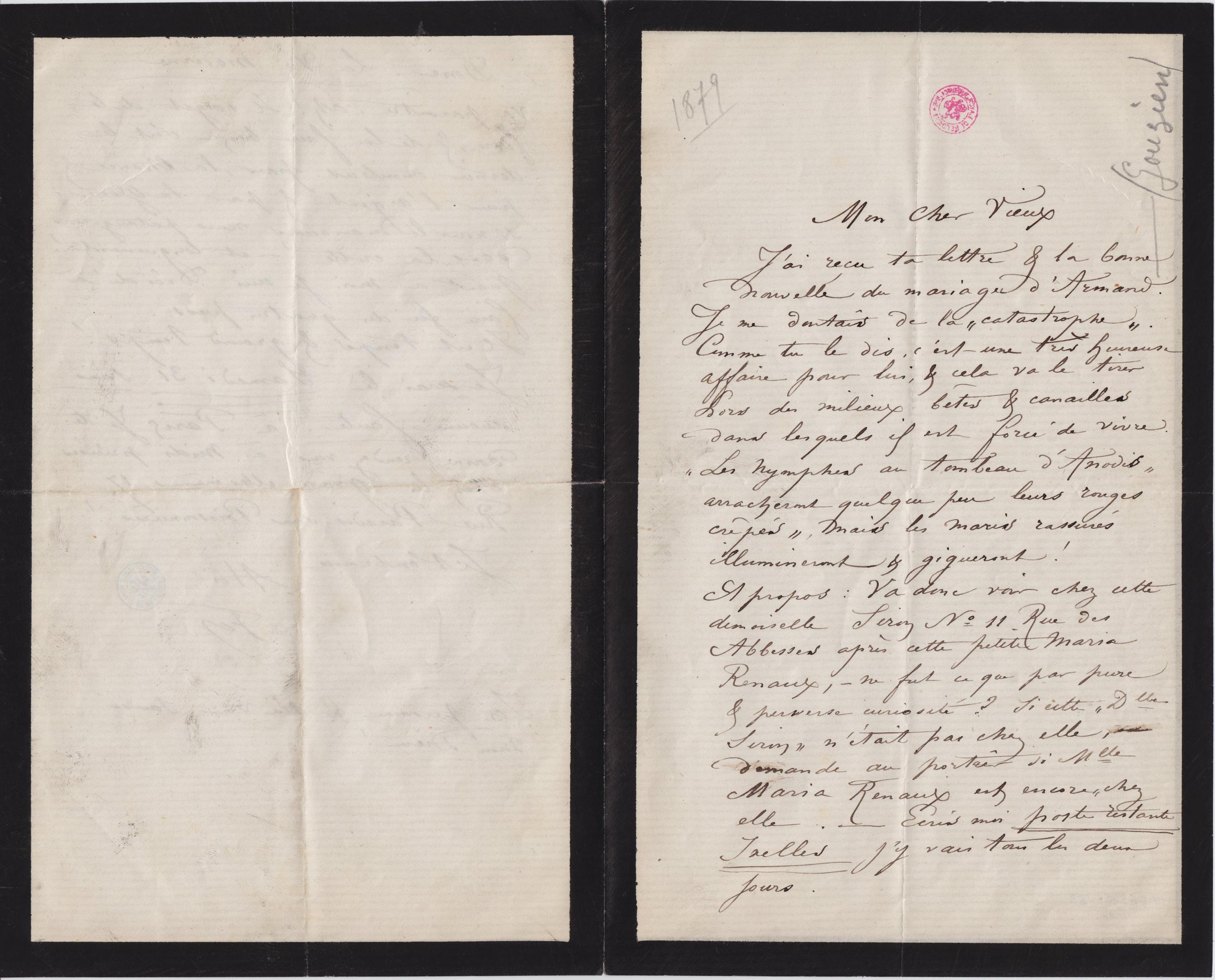 J’ai reçu ta lettre & la bonne nouvelle du mariage d’Armand. Je doutais de la « catastrophe ». Comme tu le dis, c’est une très heureuse affaire pour lui, & cela va le tirer hors des milieux bêtes & canailles dans lesquels il est forcé de vivre. « Les nymphes au tombeau d’Anodis » arracheront quelque peu leurs rouges crêpés », mais les maris rassurés illumineront & gigueront !